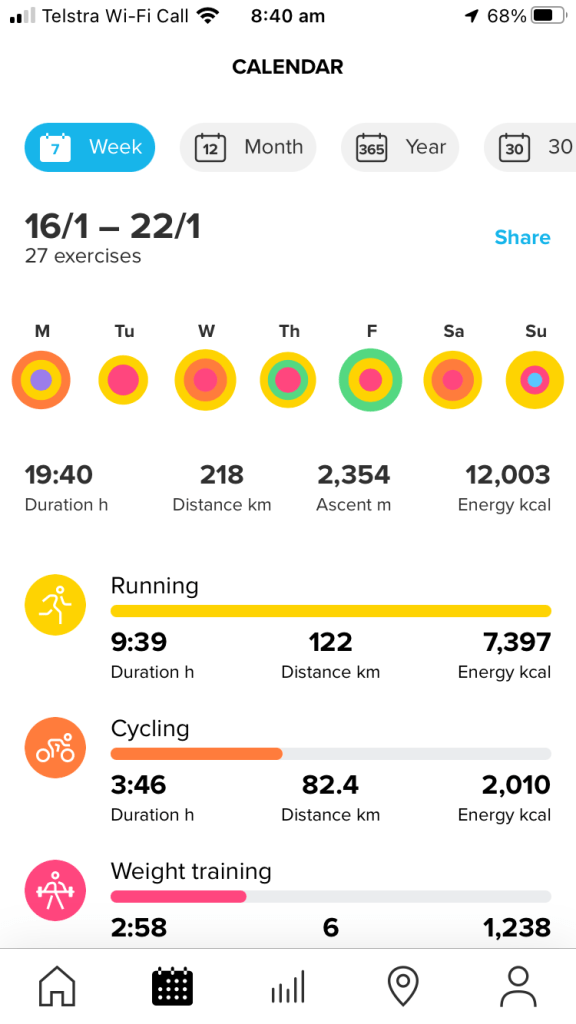 Final week of January and time to start really getting serious. This week had almost all of what I’d expect from a normal training week. It had the same amount of strength, cycling and walking work. A session of 12*400m on the Tuesday was good for my first dedicated speed session. A mid-week long run was in there again. Sadly, didn’t fit in a Thursday effort due to working all day for Australia Day at the pool but still got an easy run in though. Saturday was another Parkrun visit, this time treating it as a ‘tempo’ race at semi-goal marathon pace (around 3:30/km) and in windy conditions I was pretty happy with how it felt. Best run of the week was the Sunday long run though, 30km, 15km out and back on the one road, in the rain, no music or podcast and felt very relaxed and fresh still by the end of it showing me the my fitness is allowing me to recover from my daily runs pretty well now.