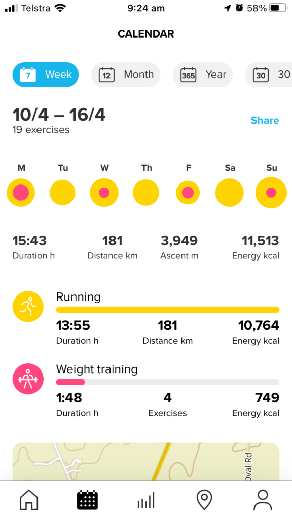 The week of 10/4-16/4 I ran 180km’s with almost 4000m of elevation. My Tuesday 400m session on the road at Warren’s Gorge was a highlight as I whacked on an extra 4 flat 400m’s after the 8 I’d done up the small hill as per usual. These extra 4 were all done at 2:50/km pace meaning I’d dropped under the magical 3:00/km barrier I seem to rant on about whenever I go for a crack at running a fast 5km. Another highlight of this training week was the amount of elevation I covered between Saturday and Sunday’s training runs in and near Belair (having travelled back to Adelaide for a family obligation).
