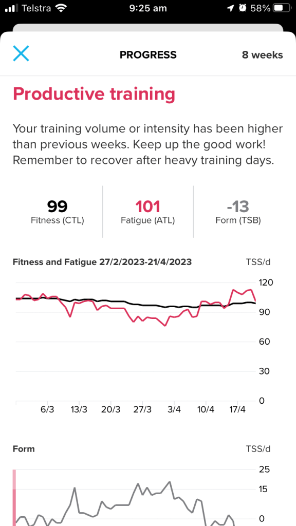 Now, what training have I been getting up to then in the last week of school/first week of school holidays since I last logged online? Quite a bit. I’m not getting up at 5:30am to play tiddly-winks.