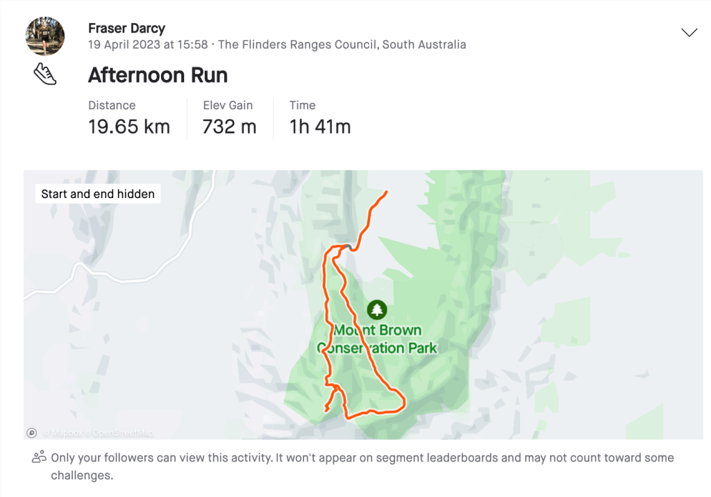 Introducing Mt.Brown, and running up Tilley’s Hill Road on the previous Saturday is an example of what I’ll be doing over the next month. Locating different hills, other than Dutchman’s, with similar gradients to that of the course in Austria for the World Champs, and just session’ing them to get more weekly elevation and to keep my mind fresh. Mt. Remarkable and Alligator Gorge Rd are two alternative hills I’m hoping to get to in this block.