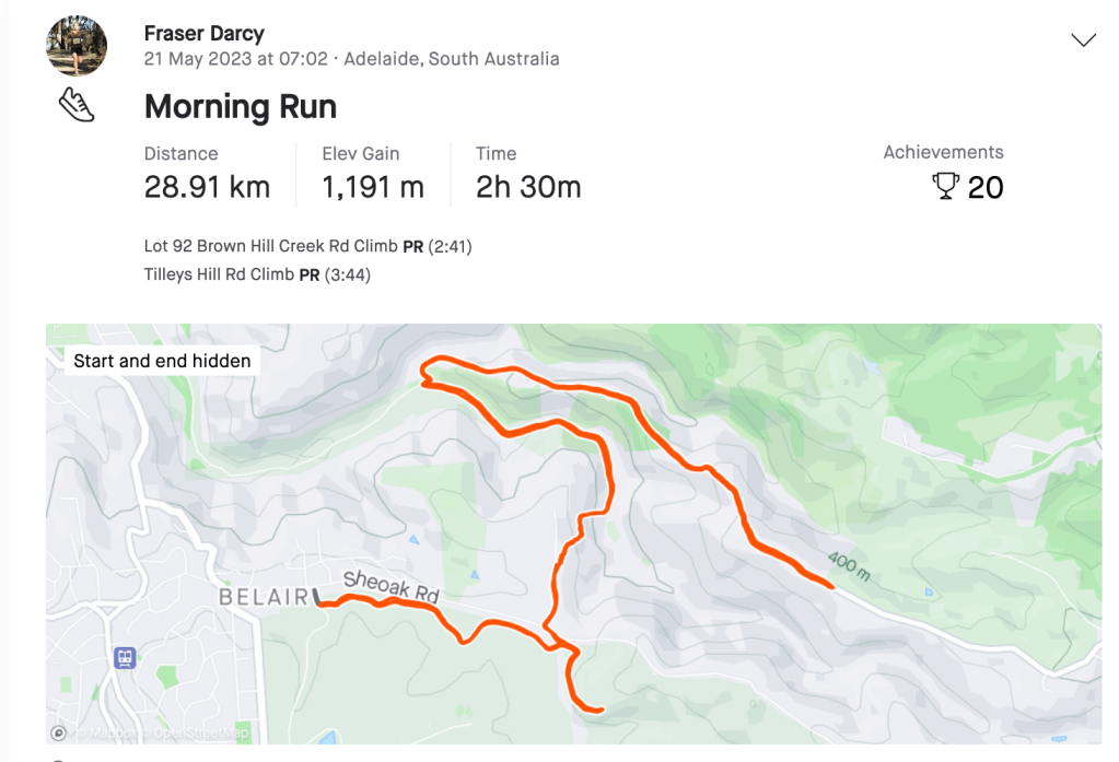 Wednesday 24th May: The return is coming. By now I’d ticked off most of the big ticket items for the week but I hadn’t gotten a release yet. That moment when your body goes ahhhh as it relaxes onto the couch. Running (or more so falling I was that stiff) down the start to my Warren Gorge running loop I wasn’t sure what to expect from this run. Supposedly I was to do some 400m repeats as is the norm at Warren Gorge. But I felt pretty shit to be honest so just kept running out with the wind behind me for a bit longer warm up than normal. Then I turned around and ran back to the car. Then I got to the hill where I do the repeats and started running up, then down then up. Then I started running the flat 400m repeats. Then Craig Mottram came on the podcast I was listening to and this man was THE man for running in the late 2000’s. Even when I wasn’t a running fan I knew Craig Mottram. And here I was getting it done while Craig explained how he got things done in the late 2000’s. An hour and ten minutes later I’d done all my 400m repeats by not really thinking but just doing them. And now the body was feeling good. I had gotten my ahhh moment and had relaxed into it. I continued on running for enjoyment because that’s the best medicine for a tired and depleted runner. Reminding yourself that running is fun. 21km’s later and I was feeling confident about my fitness.