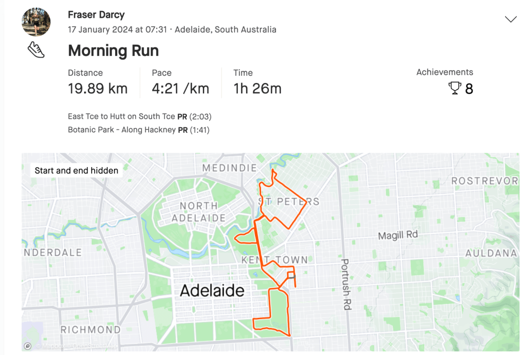 That wasn’t the only group running I did this week though. The very next morning I joined in for a mid-week long run with the Cocks brothers, Jess Stenson and Tom (from Sunday’s race) through Adelaide’s eastern suburbs/parklands. No real need for a major breakdown of this 90 minutes of running but it was a real treat to again be taken on a tour of some good running locations, all without thinking of where I was going, amidst some quality runners. I wasn’t so much out of my comfort zone with this run but it was another step in doing more with these runners who do pull me out of my comfort zone in races.