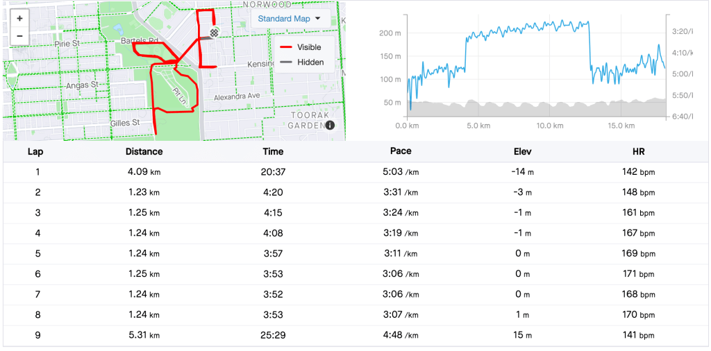 I hit publish on The Blue Line just after 6am and almost had a beer. The closest I’ve come to having a beer in the morning is having a non-alcoholic one after a Sunday long run. On Friday morning instead it was black coffee and peanut butter on two bits of white toast. After digesting that I started my run. My ankle was still giving me grief each run even though I was icing it and using some anti inflammatory cream. I was excited for this run though because I was going to use my fast shoes which provide a different level of support so hopefully won’t make my ankle hurt as much (although the pace I was planning on running was obviously going to do more damage I think). After a 4km warmup I had decided on doing 6*1km (instead of 8 like I had been doing) off 60 seconds rest into 4*400, with 60 seconds rest and then 4*200 with 60 seconds rest. The aim was to run the 1km’s at 10km pace, the 400’s at 5km pace or faster and the 200’s all out. If I’m serious about running a 3km in a couple of weeks I need to practice a speed faster than what I have been doing my 1km reps at these next two weeks, hence I needed the 400’s and 200’s. While this might seem like a distraction from the focus of marathon training I think the strength and zappiness I get from running under 3:00/km once a week makes holding my estimated marathon pace, 3:15-3:19/km, a lot easier and gives me confidence. Plus it’s fun and enjoyable to run fast and the more that training is fun and enjoyable the more likely I am to do it and do it well.