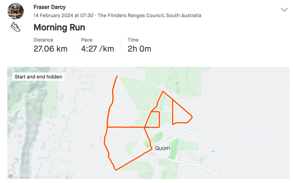 Maybe I should stop. This isn’t much fun. Is this just the come down from a good weekend in Adelaide. You just haven’t gotten into the rhythm of Quorn life yet. That’s how it went for about 1 hr and 45 minutes until I ticked off the planned 25km’s. My body relaxed a bit after that, ah I’ve got it done despite the wind. I relaxed so much I rewarded myself with an extra 2km’s to make it to 2hrs. When the first 25km’s feels hard and the last 2km’s easy it just shows that I was losing the game of trying to chase the same mileage. It’s far easier to build it but you can’t build it to infinitum so here I was instead, hanging on to try and maintain my high mileage and my positive attitude to training for a couple more weeks.