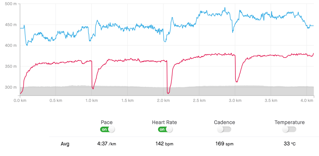 On Friday I ran 9km’s and felt pretty good. It was all without a break and although my heart rate was up higher than it would’ve been a month ago for this run I still felt ok. The Saturday morning run I went on did not go as well and I broke it up by running for something like 2 minutes with 30 seconds, or a minute off in between. Pretty clear to the breaks I took from my heart rate data below.