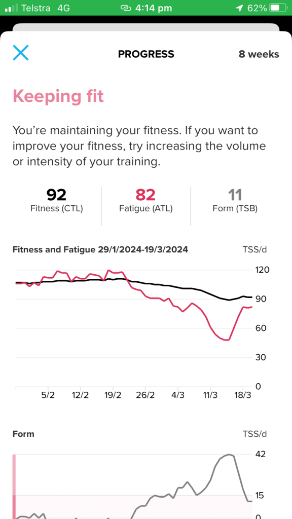 Leaning into that hope, I started well on Monday. A 10km run with only a few safety breaks to ensure I wasn’t doing anything too dangerous. It also only took me twenty-ish minutes of walking and mobilising activities to get started too, down from about thirty minutes on Saturday/Sunday. With my redemption building progress I was also now starting to focus on bringing my Suunto Training Load stats back up so went on an hour ride to get some more training stress. That was the plan at least. Instead, I got a flat tyre with 7km’s to go and had to run back home in order to leave enough time for lunch and to re-collect my bike before I started work at the pool.