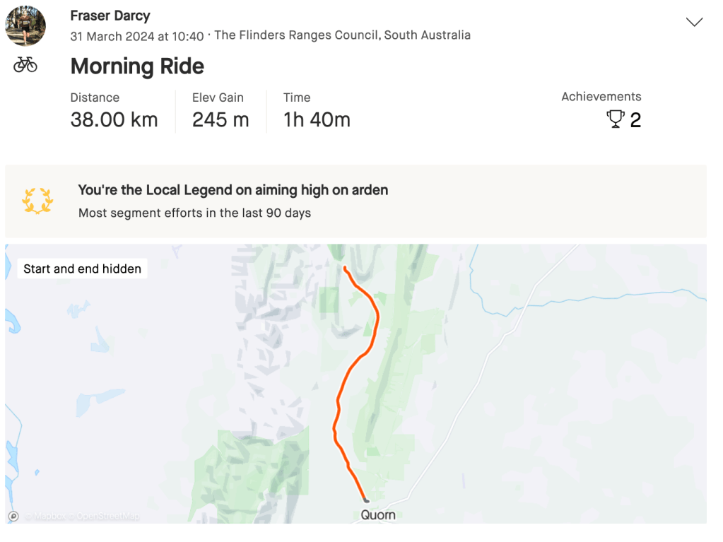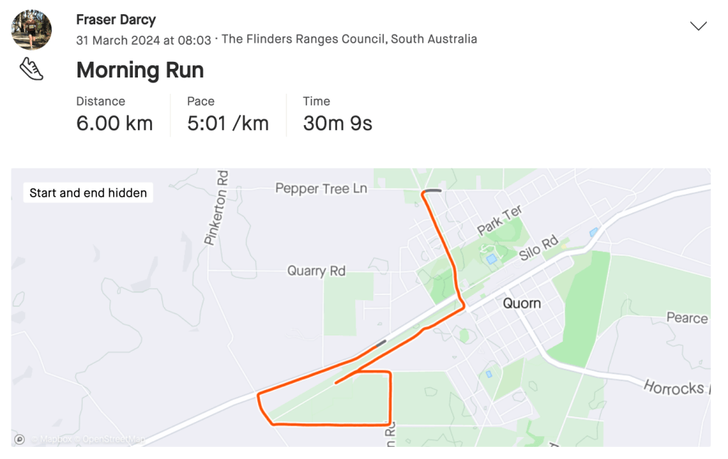 No I could not. Instead, I experienced a fair bit of regression and barely hobbled through 30 minutes of running before a walk of shame and disappointment as well. Oh well? Nah the rest of Sunday was not that oh well. I was pretty dejected actually. I’d had such a good walk up Devils, I was in my groove, the Bombers won, I wasn’t working this afternoon, give me a fucking break, I just want one run that goes smoothly. Moping around at home like this doesn’t change much so I moped out on my bike all the way to Warren Gorge and back for 1hr 45 minutes of riding. I didn’t have much time to mope for the rest of the day after that as I got stuck into some writing tasks for various Quorn community groups and started writing some coaching programs for the people I coach with RunAsOne. By the end of the day I was feeling a bit better about things but was certainly hoping to not regress any further on Monday.