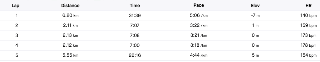 On Saturday morning I slept in a bit and skipped the unofficial Quorn parkrun so I could focus on putting together a second faster run for the week. At first, I didn’t feel as fresh as I did the two days prior when I completed 3 laps of the 2.1km circuit I run on with a minute break between laps. I still started anyway and planned to run the same 3 laps at about the same pace just without the minute breaks. If I could finish the last one faster that would’ve been a bonus.