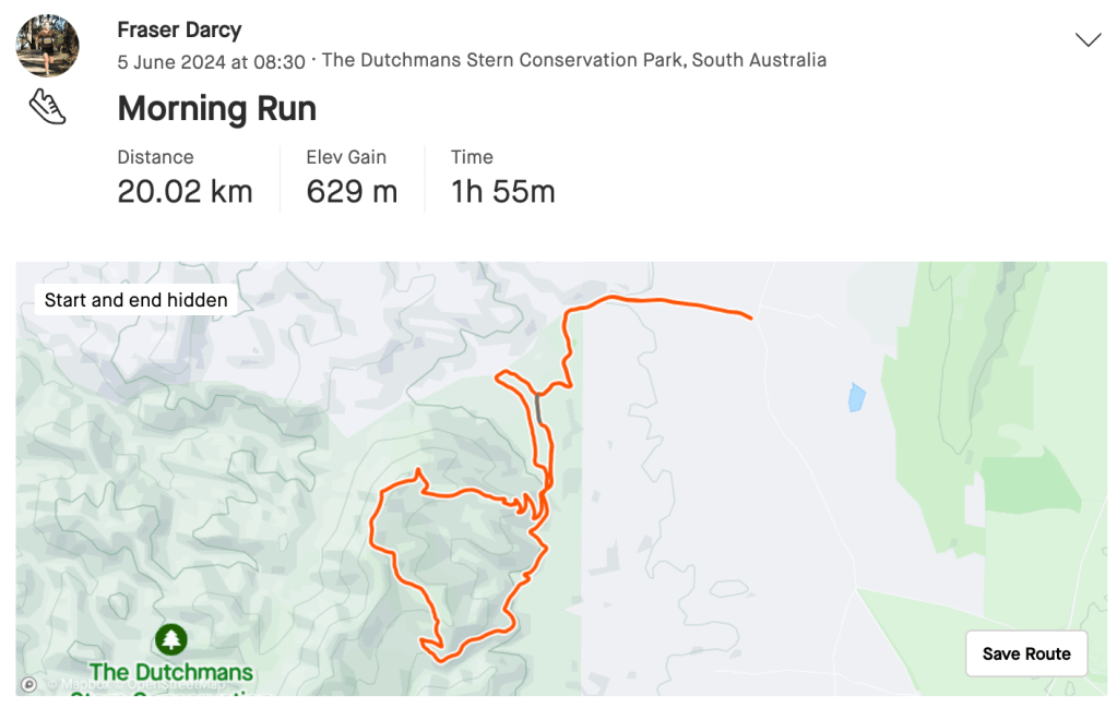 On Monday it was an hour and a bit easy in Belair with a very tight left hamstring following Sunday’s TRSA Kuipto Forest race. I hoped it would get less tight over the course of the run but it didn’t. A bit of stretching and foam rolling throughout the day made a slight difference for my arvo run but it was still tight and I was a little concerned as to how it would pull up for Tuesday morning’s session with RunAsOne.