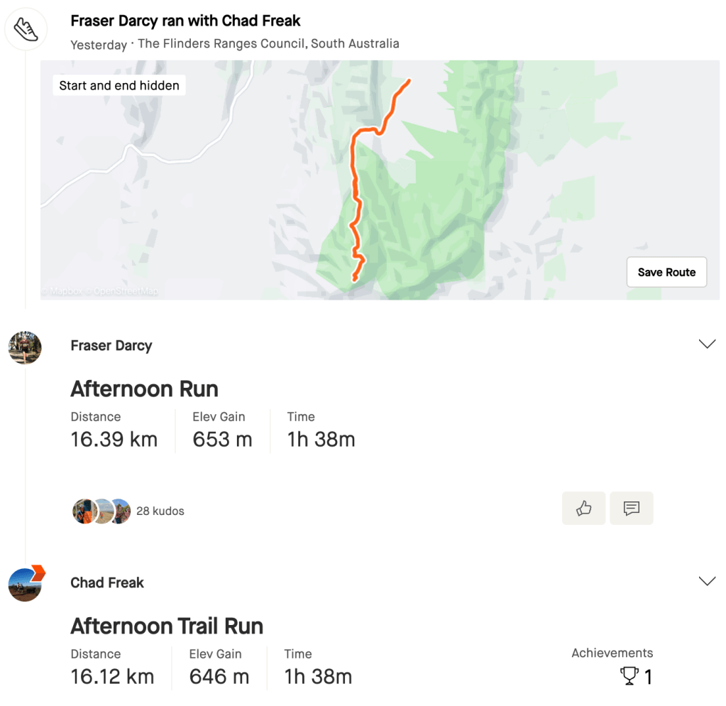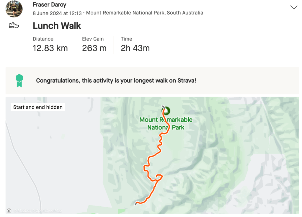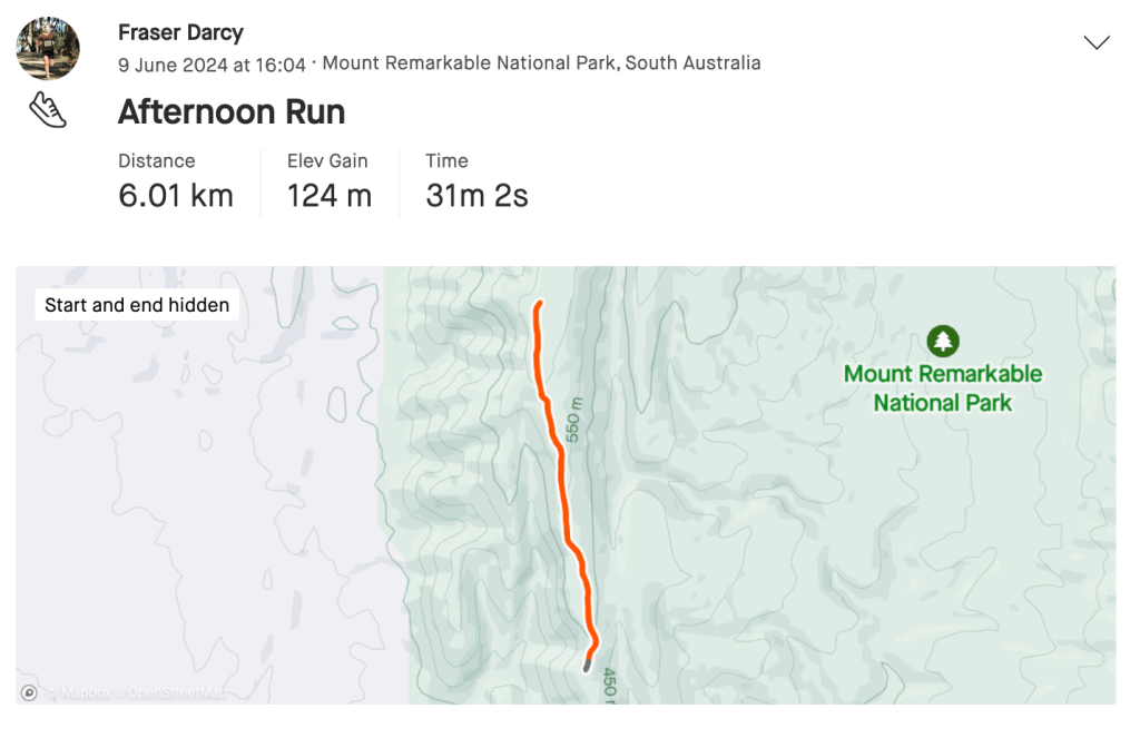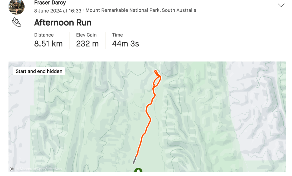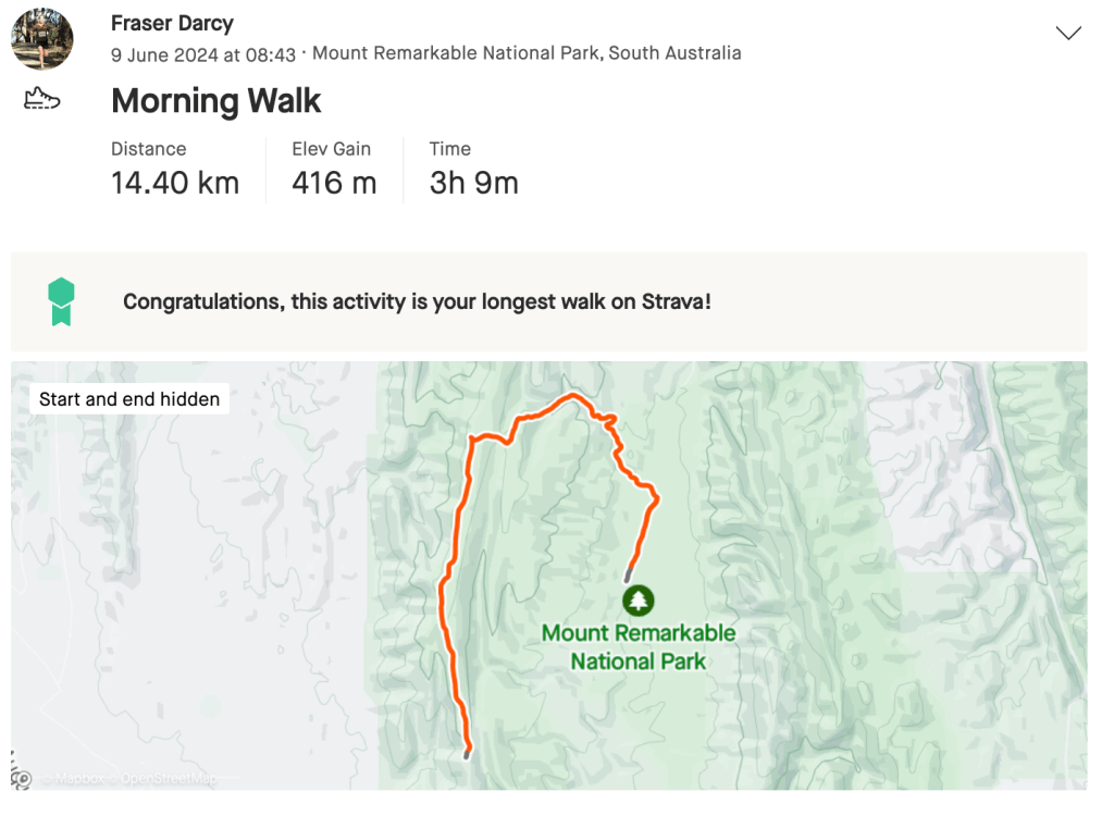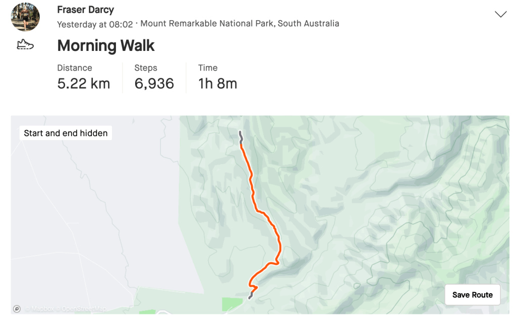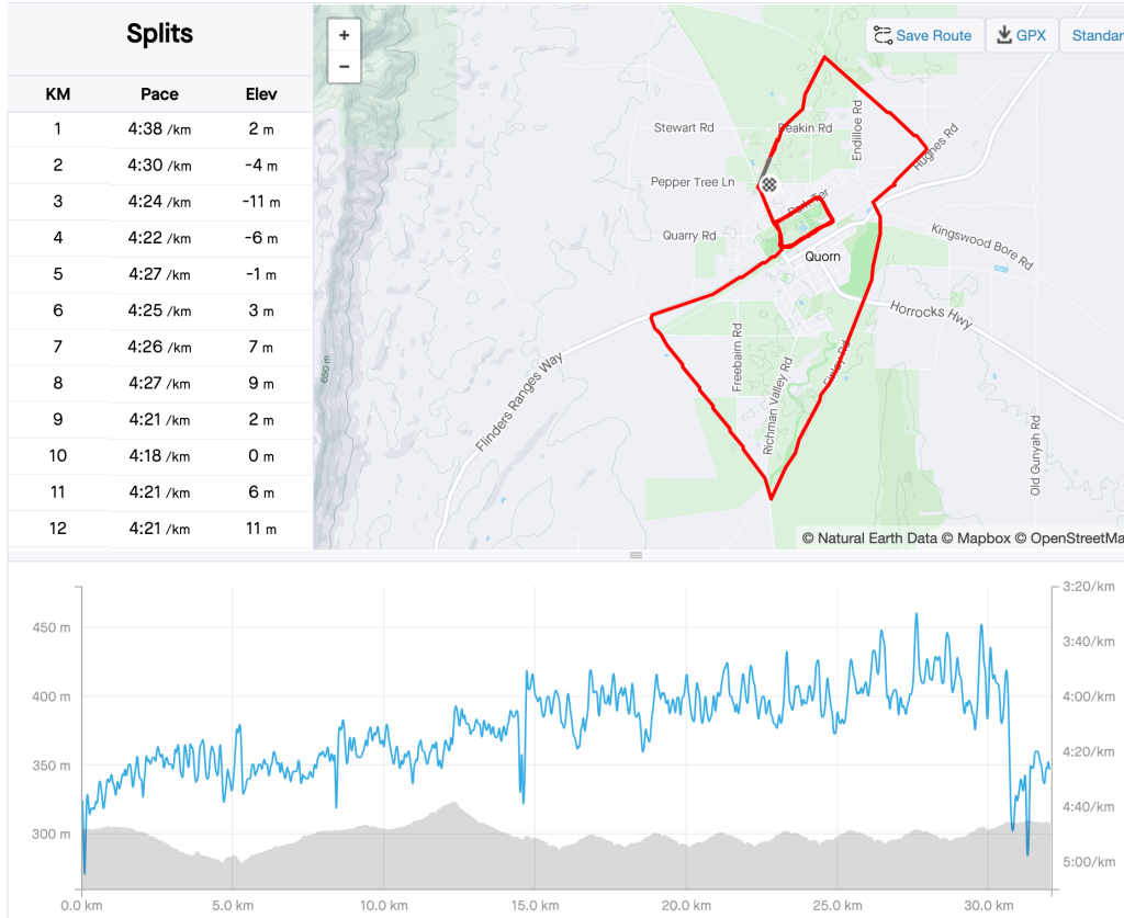 It was very nice to get this done before the bush walk and in the style I did. It’s probably up there with the top 5 long runs I’ve done by myself in Quorn. I carried that confidence about my achievement with me for the rest of the day knowing I had ticked off all my important running sessions and if I got any running in during the bush walk that would be a bonus.