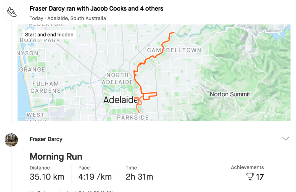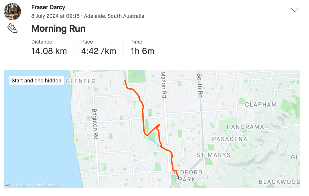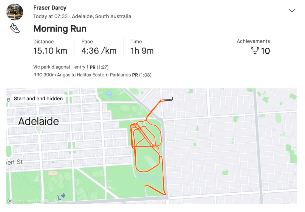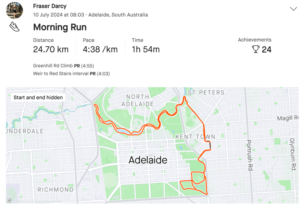 So much so that I increased my Wednesday run out to almost 2hrs. Albeit at a moderately cruisy pace of 4:38/km it was still nice to feel good after almost 2hrs. Staying down in Adelaide and with plenty of time up my sleeve it is a real treat to be able to run 24km’s along the Torrens and in Vic Park. All those times of running 1-2.5hrs on the backroads of Quorn has made me really appreciate what it’s like to run next to a creek with water in it or run past the Adelaide Oval.