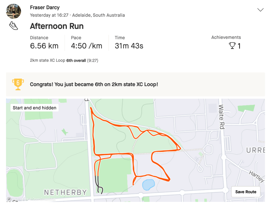 What I won’t be changing my mind about is the plan to try and hit around 180km’s next week and continue The Great Sauna Project for another two days at least. I am racing the State XC Championships on Saturday (10km) and will cancel the sauna for a couple of days beforehand and also miss my normal Friday session. With the mention of State XC though it does give you something to look forward to in next week’s recap for there will be another race recap! State XC is an exciting race as well because it doesn’t mean anything for trail running or road running. It’s just a pure race for racing fun! I enjoyed the one I wrote about a month or so ago and am approaching it with the same attitude, i.e. have a good race, and give it a crack. Until then, have a good week yourself and thanks for reading.