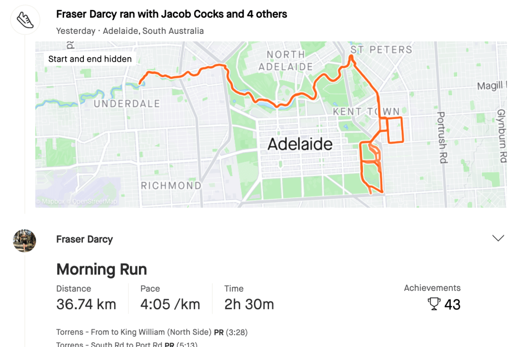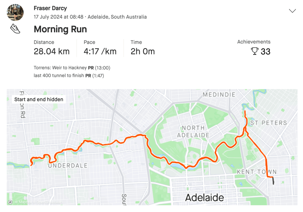 Wednesday. Mid-week long run day. Last week I was happy to run just under 2hrs. This week’s goal was therefore 2hrs on the dot. I went out along the Torrens on the same path as last week but instead of spinning around at Port Rd, I just kept going. I was happy enough to have only one route choice decision to make instead of trying to find good loops in Victoria Park to keep me motivated. There was a fair bit more rain than I expected throughout the 2hr run. I was worried my headphones were going to get cooked but in the end we made it through. The presence of my headphones and music meant I got ‘rolling’ a bit towards the end which was an unexpected bonus. With Hills 2 Henley on the cards for next Sunday I was keen to see what 3:30/km felt like in my jogging shoes and whether it’s doable I could race it in them (to protect my good race shoes). It didn’t feel too bad so the option is definitely there (and I would’ve raced it in jogging shoes two years ago and been none the wiser). The pickup in pace meant I cracked 28km’s for the midweek long run in 2hrs.
