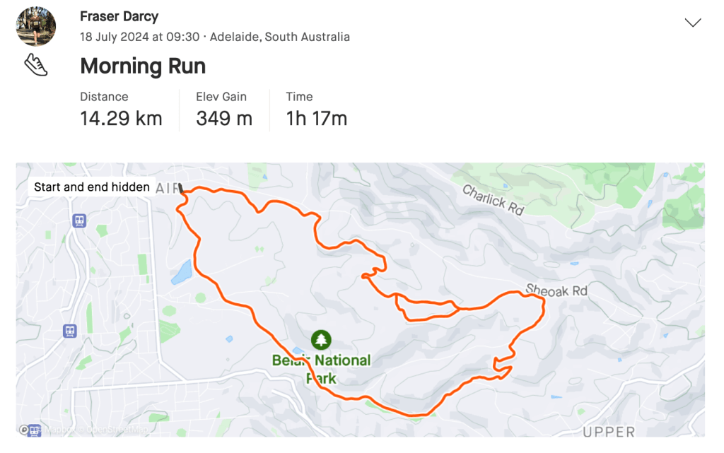 Just kidding. The week always starts on a Monday. Which also means the vagaries of Monday’s moods are forgotten and a little less colour is involved on Monday’s recap. BUT THAT’S WHERE THE WEEK STARTS, so, on Monday, I ran an easy 16km’s along the Sturt River. 2 more km’s than last Monday’s efforts. Fairly good. Easier to do it a day after a long run and not a day after a trail running race as I did the week before. I followed up the run with a sauna, some jobs on the computer and an easy arvo run. The arvo run was at Belair just double checking the location of the RunAsOne (RAO) trail session so that made it easier to do as I felt like I was doing a job out there.