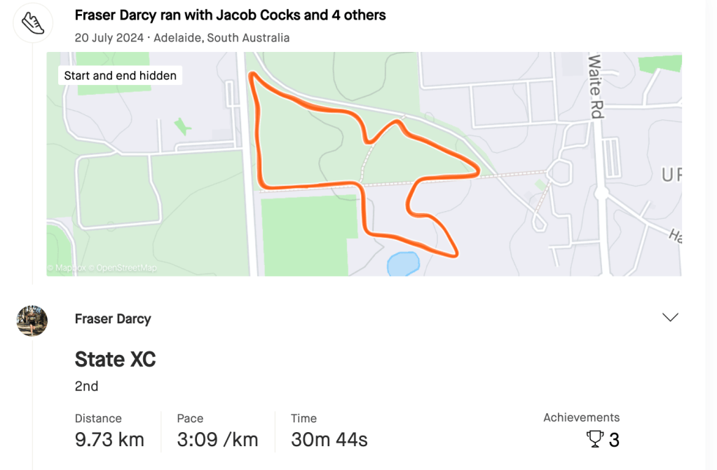 The context to dropping the hammer on the last lap and ensuring I race somewhat ‘uncontrolled’ through to the finish line was that at last year’s State XC, my first XC since high school, I finished over two minutes behind Jacob. Hence, my other goal, if I couldn’t hang on to him for as long as I hoped, was to not lose by more than a minute this year. At each lap I was able to get a glance of how far he was in front and with this final lap to go I had thirty seconds to play with. I made sure I did empty myself on the final uphills and downhills but noticed how, much like in a trail running race, my acceleration into and out of corner’s was a lot slower than the first lap. That’s just natural I think. My increased effort on the final downhills and flat helped make that lap the same time as the previous two laps and also meant I managed to finish in under a minute (around thirty seconds to be exact) behind Jacob to claim 2nd place in a proper State Championship. Pretty cool in that aspect but it also felt a bit hollow knowing there wasn’t a very strong field this year.