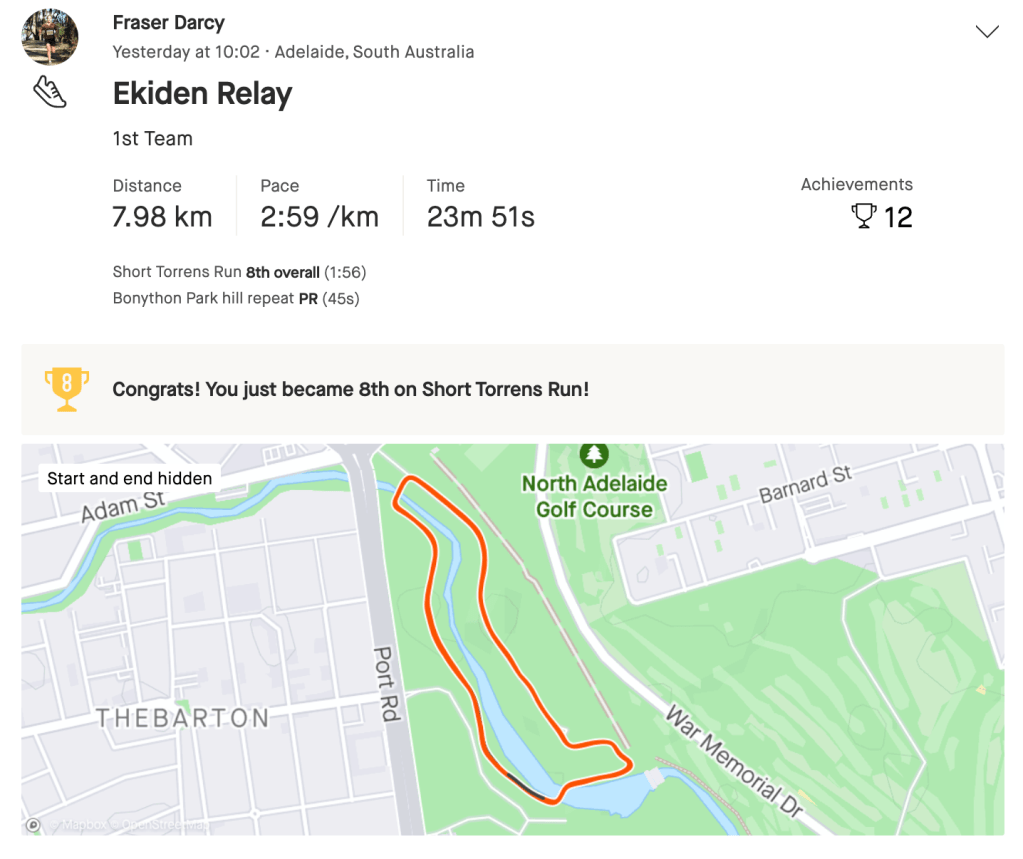 The little hill was stinging on the third lap and I had to really concentrate on accelerating out of the turns but again I clicked 6:00 for the third lap. I had 7 seconds spare essentially in the last lap to hit sub 24 minutes for 8k. I had a few carrots to chase on the ‘back straight’ which helped spur me on to the finish and eventually ran 23:52 to tick my goal and give the team a big lead. With the way the other closest team to us chose to order their males and females (differently to us) we didn’t actually know how far in front we where and needed to be in order for our last runner to be in the lead. The way it worked out was perfect for the theatre of it. The last runner of our team and the other, as it turned out, equal first team both started off together. They came in together at the end of the first lap, the second lap and pretty much the third lap of their own 8k leg. The opposition’s runner was definitely the favourite while our runner was an U/20’s weapon who doesn’t have much of a resume but what is on there is a 14:20 5k. Everyone loves an underdog getting up or a champion team who is up against it finding a way to win and on Saturday that was our Flinders team. The young fella torched second place on that last lap and our underdog team set a new CR. A great experience to be a part of.