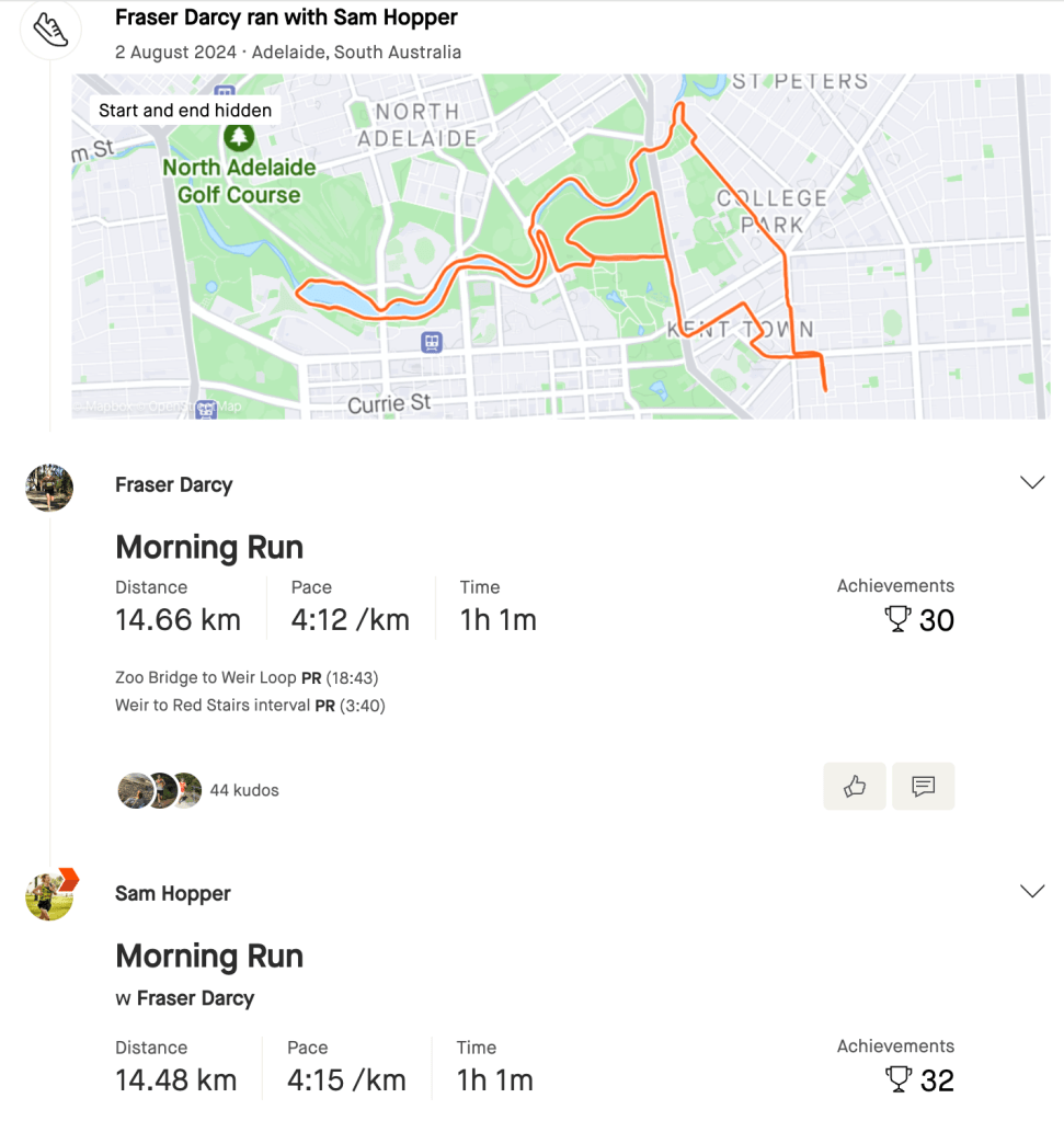 Tuesday’s session at RunAsOne was a simple progression run where the crew runs in circles getting faster each lap for thirty minutes. It’s not as boring as that sounds, the circle is 1.25km’s big, and I play some music on the bike to make it interesting. It is straightforward to set-up for though which means come my own 9:30am session with Connor and Adam, I had a good amount of energy. Having ticked off some k’ reps last week we were back doing mile reps this week. There was 5 of them with the 2nd and 4th ones consisting of (400m hard/400float)*2. Adam and I ran the first four together and then on the fifth and final rep I progressed a bit faster throughout the rep to give me some confidence that I am in good shape. I was a bit sore afterward and decided to see what an afternoon without an easy run would do to my hip so instead of jogging for thirty minutes I did thirty minutes of foam rolling and stretching and seeking some advice from Emma (an actual physio, and not just a Google trained physio like me). Emma prompted me to think about how much single leg work I’ve been doing lately, which is none, which then prompted me to do some single leg work and ipso facto my hip felt better. Physio advice works, who knew?