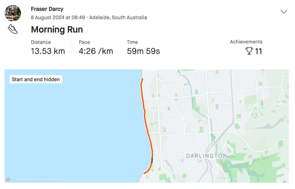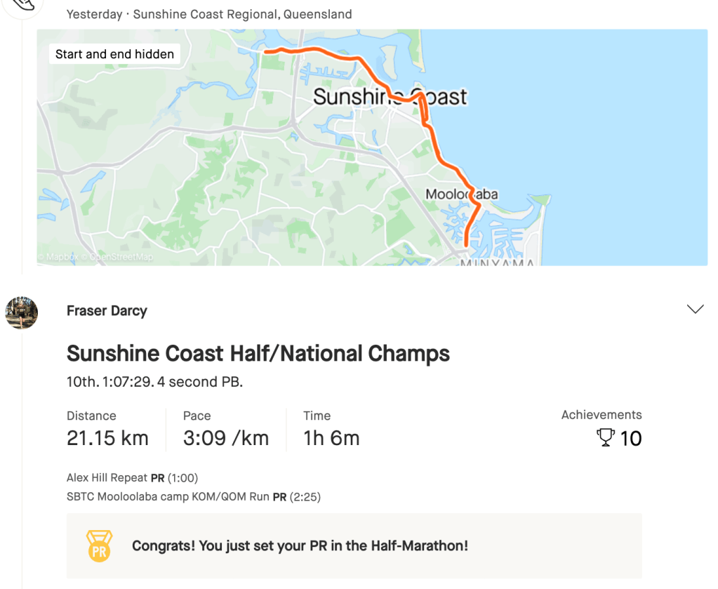 I did finish though in 1:07:29 for 10th place. Less than a minute behind the two guys who I ran with for most of the way and I wasn’t passed by anyone from behind so that makes me glad as that has been my downfall in interstate trail races. So from that context, I’m happy with my race tactics of choosing to bridge the gap early and not drifting too far back to let anyone pass me. I’m happy with my race efforts as well considering I pushed myself pretty well to the end. I did think to myself, it’d be nice at least in the scenario that even if I don’t get my goal time I at least can be recognised as someone who tried to go for it, fell of the pace at the end and still dragged the best out of themselves with what they had on the day. I’m not sure I’m happy with the conditions on the day. None of the other top 10 runners ran a PB which is an indication it was a slow day. Maybe it was windy, maybe it’s the hill, who knows. The effort and process is all that really matters. I think I’m happy with my training/taper process/strategy. If I was really targeting just this one race I probably would’ve liked to do more consistent weeks of 20-30 minute thresholds on Friday’s as opposed to running all of the different races I have. Those races are great and I enjoy them but they are all slightly above threshold so not quite the most specific training for a half marathon. I also might’ve tapered a bit heavier leading into the race but as I prefaced earlier, I’m also focused on my marathon preparation. Lastly, I’m happy with my travel processes which was a big tick from this weekend. If I put my climbing hat on, to fly to another state, get off the plane, tick a PB climb in a new environment first day of the trip would be unheard of. To do that in a running sense, in my first big interstate road race is pretty cool then. It’s overall a pretty cool way to spend a weekend, fly interstate, get a free hotel, free entry, $150 to help cover flights/food, run 67:29 for a half marathon. That’s all pretty cool. The time in the end would’ve been nicer to be in the 66’s but 67:29 is still an official PB. At the time I thought my PB was 67:26 as that’s what my Strava recorded my McLaren Vale Half marathon effort in 2023 as (which I am now even more impressed with as I also didn’t really train specifically for that event or taper for it, but it was in SA so that’s saying something…). However, on checking the official results from that event I was actually timed as 67:33, so my PB is now officially 67:29 (and for what it’s worth even though my watch started late, it still registered 21.1km’s so I set a new PB according to Strava of 66:46, which doesn’t count for anything as you can’t rely on the GPS).