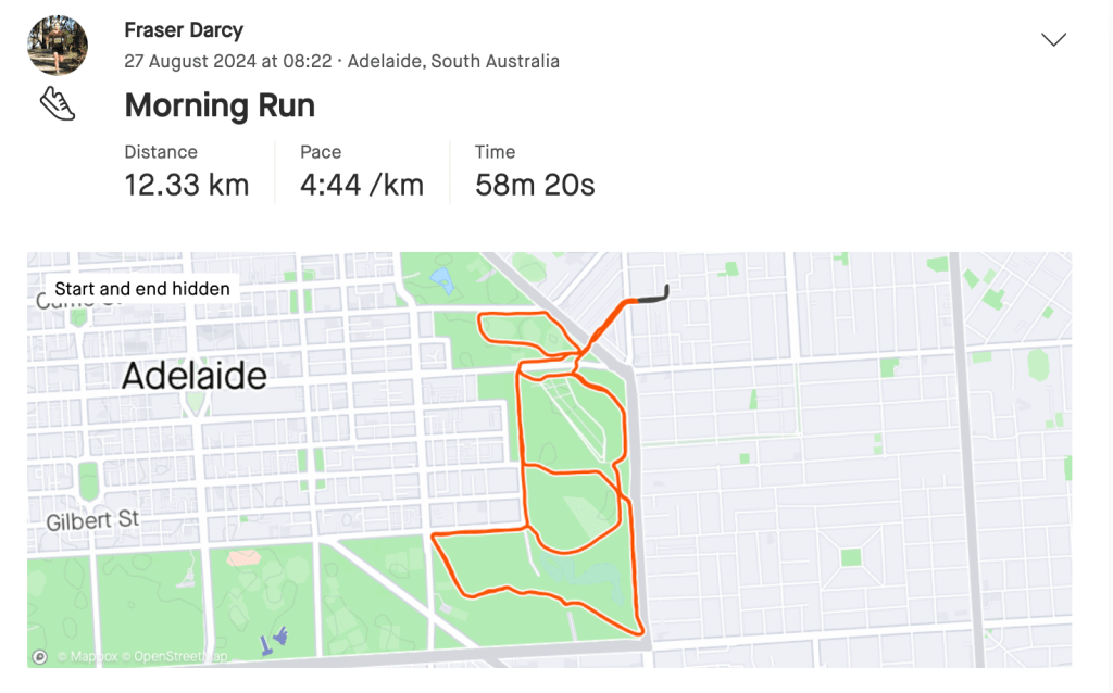Sunday’s long run. Third day in Adelaide and third morning in a row of doing something with RAO. I’m really making the most of being involved with the group I think. This long run was one of our structured ones where we set up a small drink station so runners can practice their fuelling strategies for marathons. Being a paid employee I helped set up the drink station which meant starting my run a little bit after everyone else with Riley and setting up the tent. It reminded me alot of setting up Westventure’s 17km runs but instead of having groups of Year 10 students roll through, there was 100 or so adults. And instead of me just jogging around for an hour or an hour and a half, I ran 30km’s in 2hrs instead. I thought that was pretty good going for a week after a marathon and if I hadn’t done the extra intensity on Saturday I may have even thrown some marathon pace work in there but decided against it. The other interesting part about this Sunday was it was the third weekend in a row I had collected the RAO tent and set it up after doing so for Fitzy’s 5 and Adelaide Marathon. On top of that, it was the third Sunday in a row I was running around MacKinnon Parade as that’s where Fitzy’s 5 and the Adelaide Marathon head along. This weekend coming I will be setting up the RAO tent at Sturt Gorge for a fourth weekend in a row for a race (don’t worry I’m not racing) there but at least it will be nice to get a break from the city.