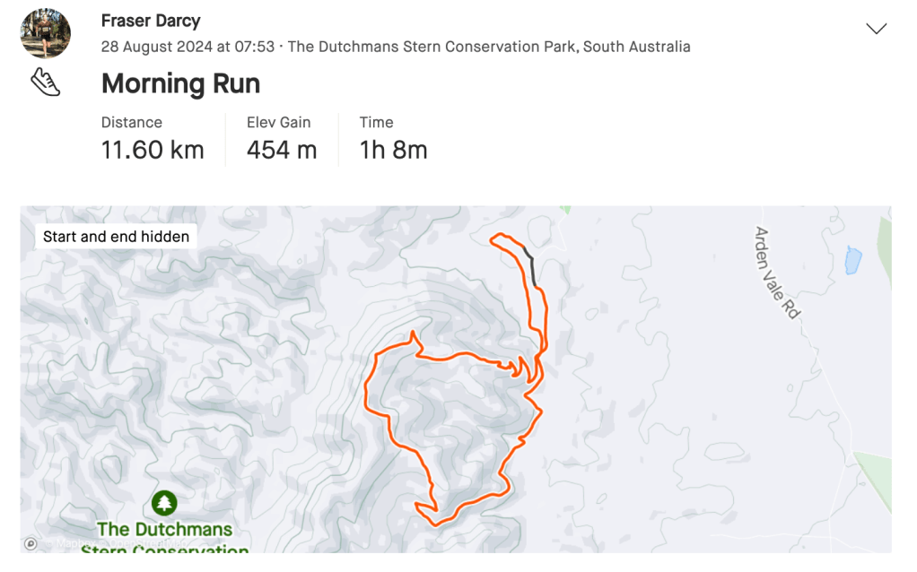 Monday. The day after Adelaide Marathon. I didn’t feel too bad body wise when I woke up. Felt a little like I was hungover, not that I drank more than 2 beers the day before, it’s just how your body feels after a poor sleep and big effort the previous day. I went down to the Sturt River for an easy 10km and wasn’t sure if I’d make it all the way. Turns out I did and it didn’t feel too bad. Probably about the same as I felt after the Sunshine Coast half marathon two weeks ago. I had a sauna afterwards, felt even better after that and then ticked off some things at home. The best part of my day was probably going for a walk at Sturt Gorge near Blackwood Footy club to check out the location of RAO’s trail session. Very relaxing.