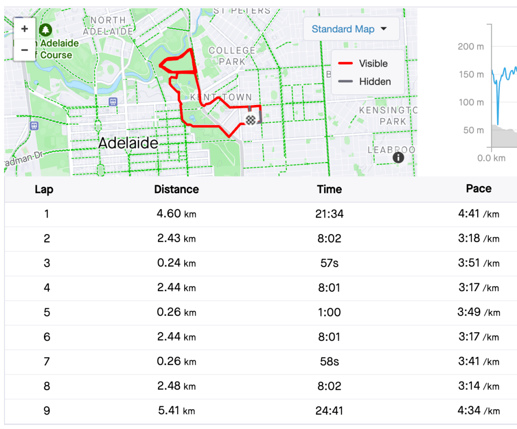 Friday. Another RAO training and again I was on the bike. Not much to report there. There was a bit to report afterwards though as I jumped in the 9:30 crew with Adam and Izzi for the first time since the marathon. Izzi and I did 4*8mins at around 3:18/km with Adam doing an extra set. This was a great session and something I realised I probably needed to do more of before a marathon to settle into marathon or just above marathon effort and pace. Aerobically it felt fine but mechanically I felt a bit clunky. Izzi commented afterwards how in my blog last week I forecasted that I would be happy if I ticked off one session at or below 3:20/km pace in the week following the Adelaide Marathon. Well, I was happy, so the forecast was right.