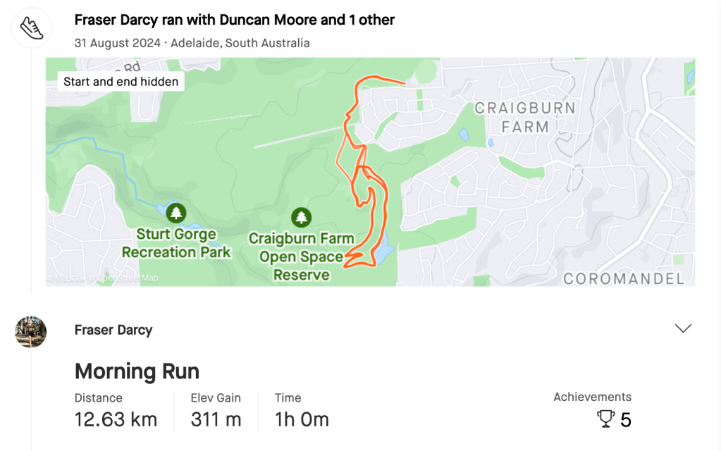On Saturday there was another RAO session but this time it was a trail session at Sturt Gorge. Feels like a lifetime ago I was walking around here on Monday doing a course check for the loop I had created. Not being a regular at Sturt Gorge I was a little nervous as to how my loop would go but it turned out fine. I wore a new pair of Asics MetaFuji Trail shoes I had been gifted for free and they were great. I probably didn’t need to put in any intensity today but after starting the group off and wanting to act as a role model I got carried away and just enjoyed pushing up the hill each time and cruising down. It was still about 25-30minutes of work which was more than I had hoped but not the end of the world.