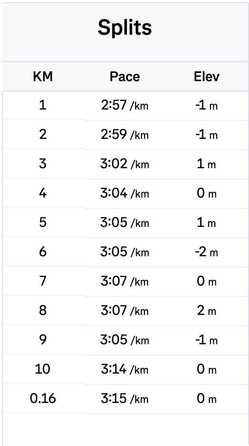 Which worked well for the first few km’s. I was on pace and feeling ok but also knew I was working pretty hard and focusing on my watch a fair bit to make sure I was on pace. That takes a lot of mental energy and in hindsight, I think that’s what makes it hard to run a PB by yourself. You want to get the first few km’s at least, if not the first half, for ‘free’ in a race you’re hoping to run a PB by just sitting behind someone and let them control the pace. Or by just racing the race and forgetting about the time. I didn’t have that luxury though, I just had some music in my headphones to try and keep myself motivated.