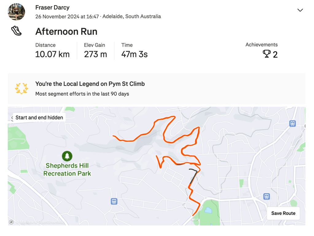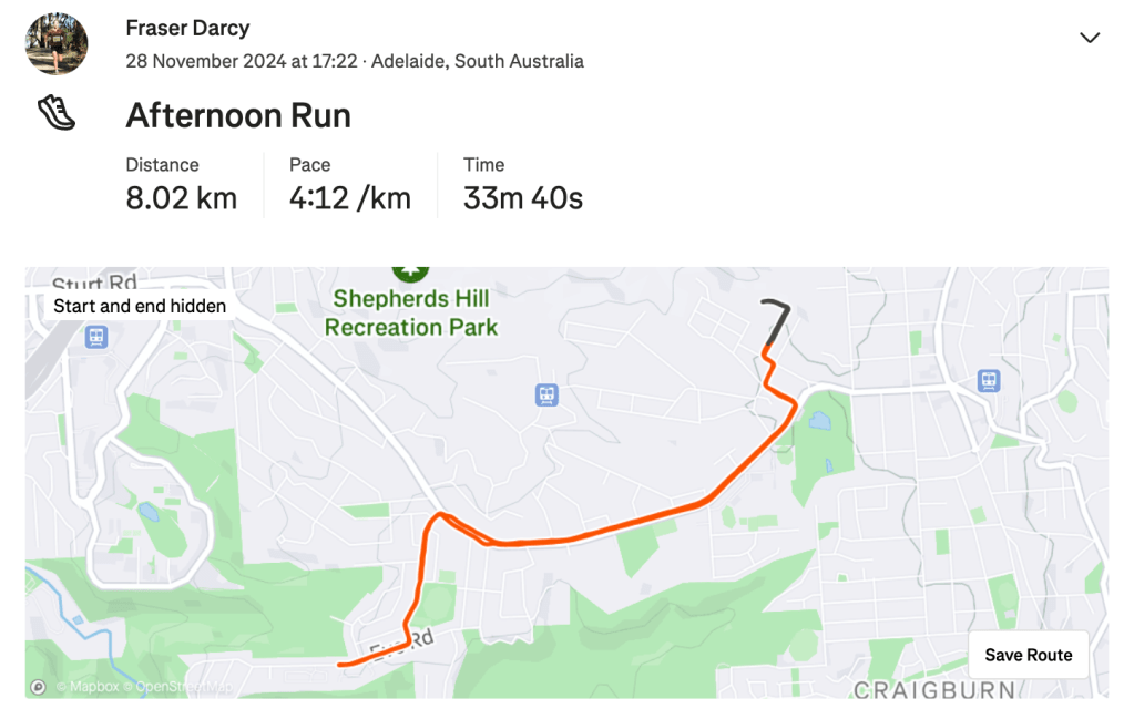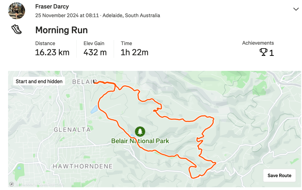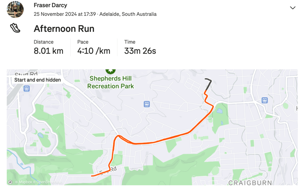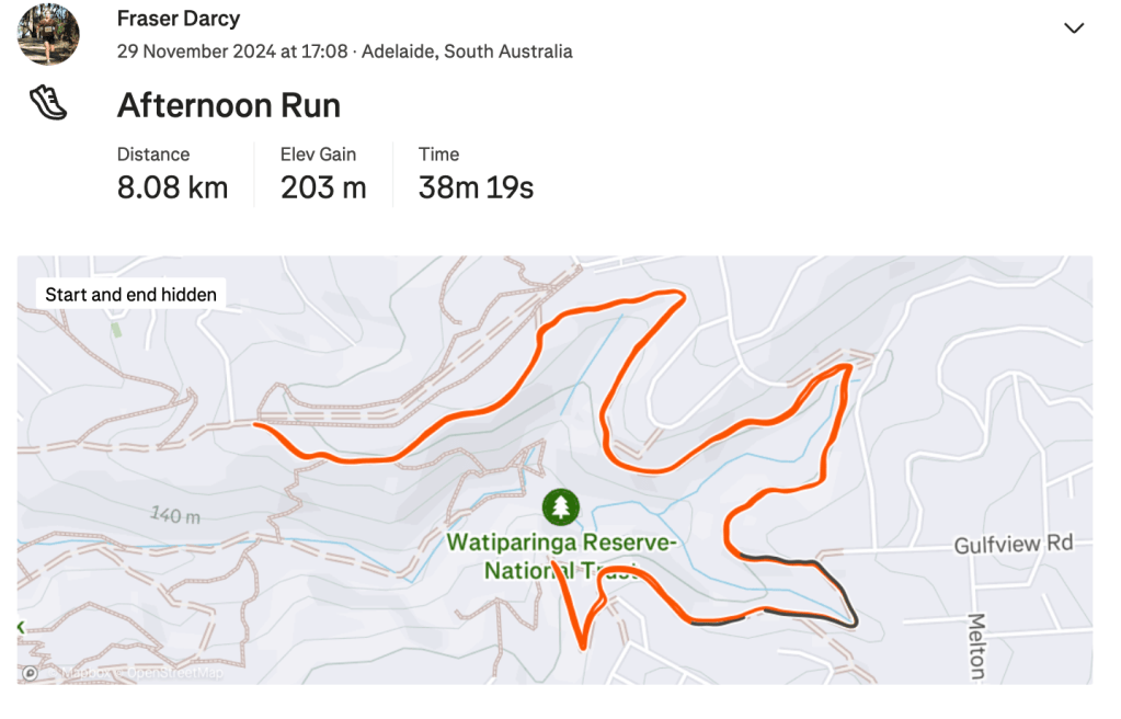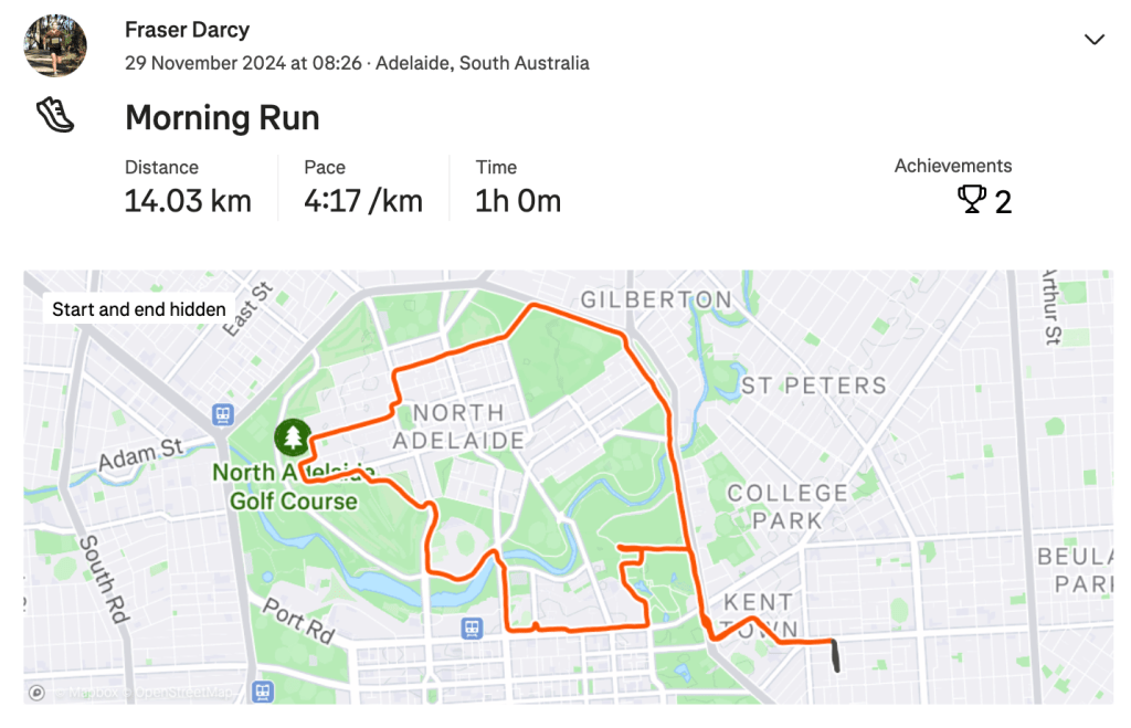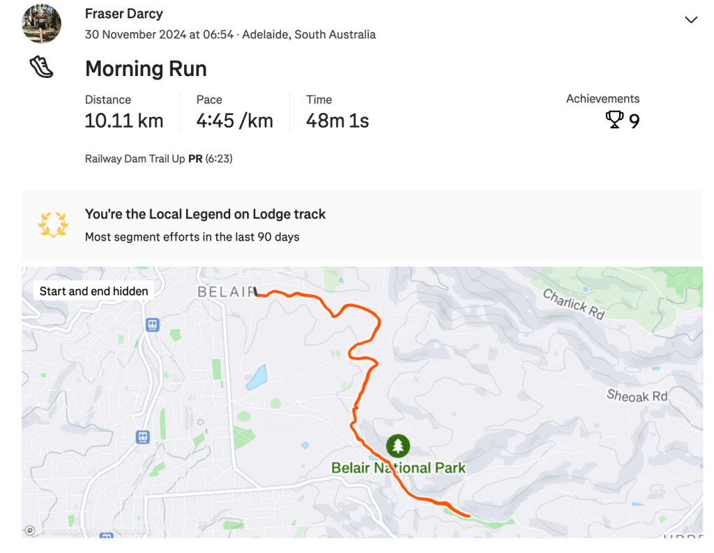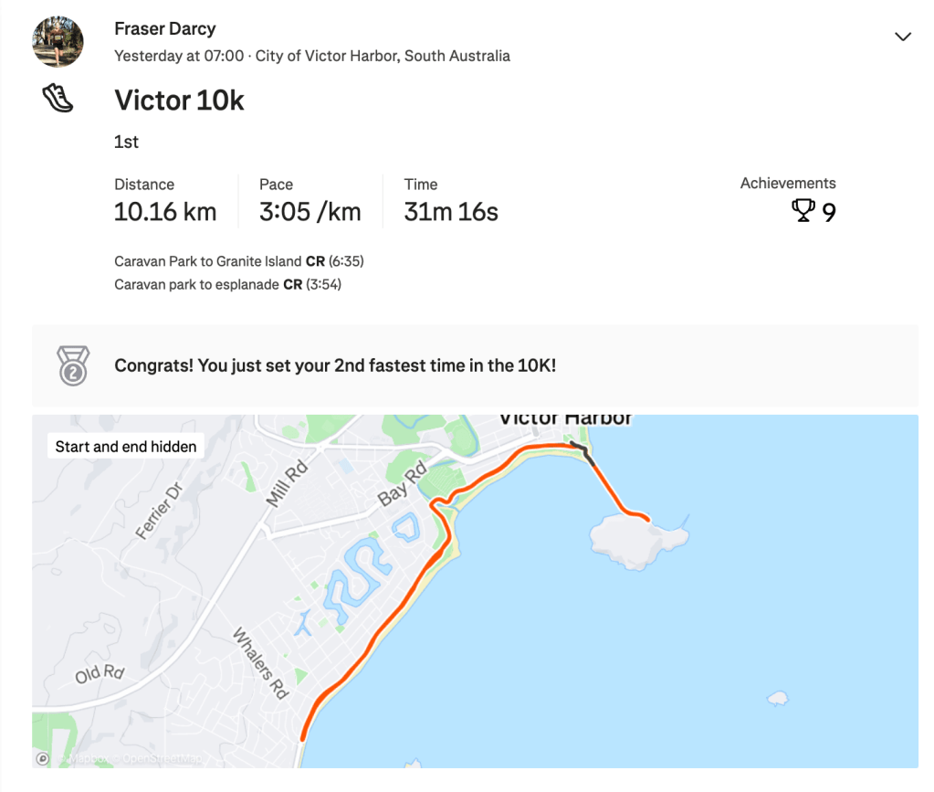 Friday came around like it always does after Thursday, and with it, an easy run through North Adelaide after being on the bike with RAO. I left this run almost a little bit too late as I got back to The RunHouse just in time to head out and collect some gym equipment. Once I finished that, it was more time doing programs and another easy afternoon run. It was nice to have just a whole easy day with no strides either. I felt very refreshed on Saturday morning running wise and enjoyed a good 10km run in Belair and some strides afterwards. From there that was it really, I was ready to race the Victor 10k.