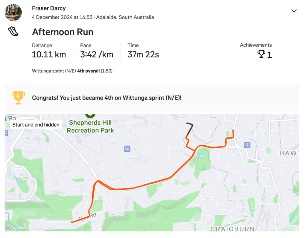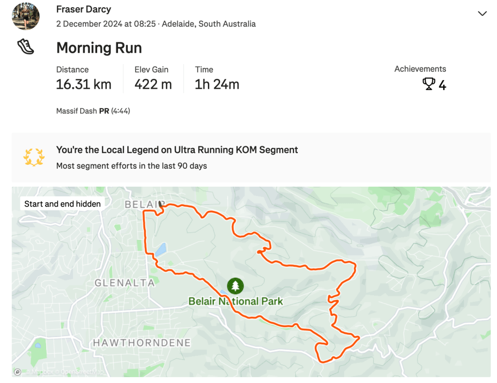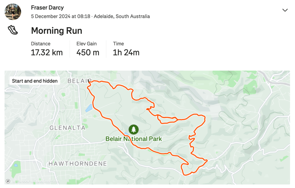 Another week of training and another week that started on Monday in Belair. I have noticed a habit of mine that when I am going well with my running I tend to stick to the same routes on the same days. There’s value in this because I can measure my fatigue or improvement from week to week but there’s also negatives in this approach because I don’t get to experience the sense of freedom and spontaneity that can come with running somewhere new. Anyway, I continued with this habit for another week on Monday in Belair and ran an easy 10 miles, bumping into Nitta on the way through. I was a bit flat to start with coming off Victor the day before but by the end felt good. Some gym work before midday, program writing in the afternoon, an easy afternoon run of 10km’s and then that was the first day of the week ticked.