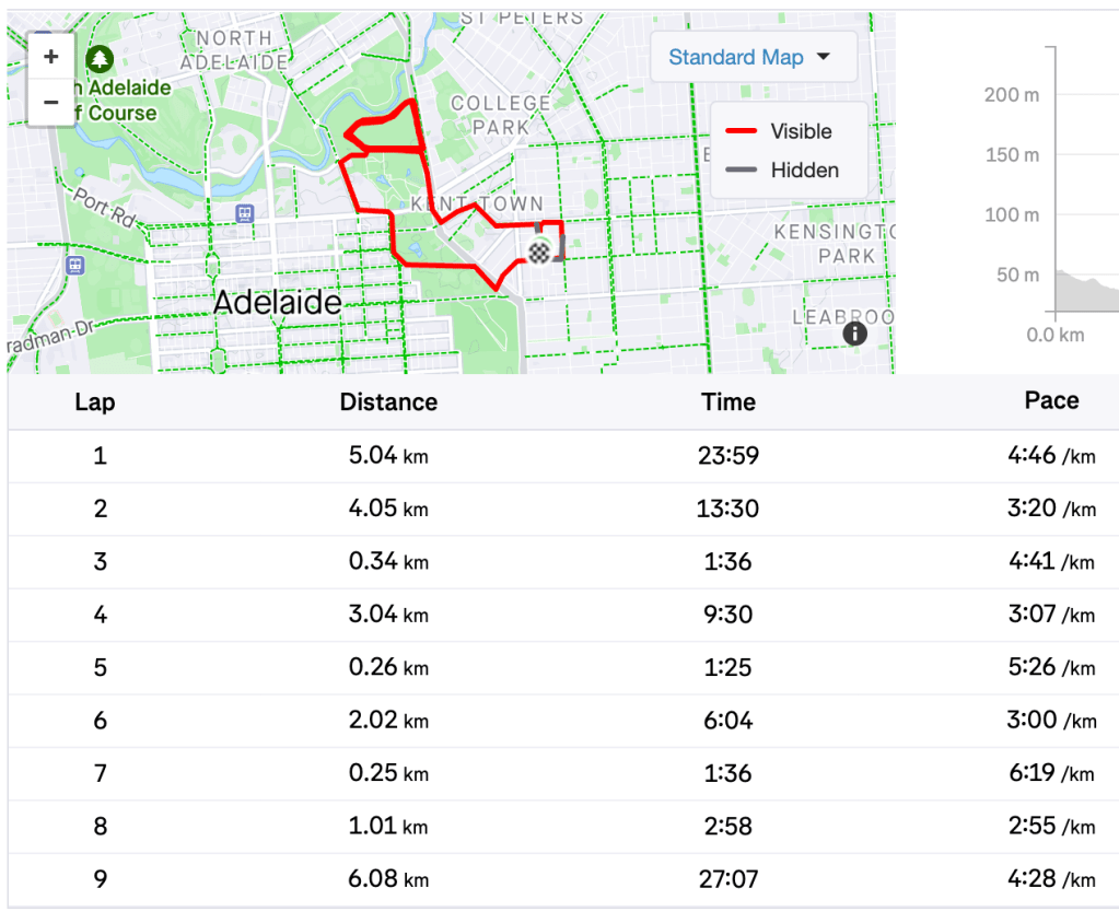 In the first interval, 4k, I had to slow myself down initially and then settled into a nice rhythm. 4k’s around Botanic is a little over 2 laps so it’s pretty easy mentally to focus on. I came out at 3:22/km for the first one, bang on marathon pace. After a short jog back to the start I got into the 3k effort which is essentially 1.5 laps. The last 0.5 of a lap was a bit too fast but since I was just running to feel I let it happen. I ended up averaging 3:10/km. A little too fast for half marathon pace but again, it was to feel. For the 2k it was basically 1 lap. The feeling was good by now, my lethargy had disappeared and my tail was up. I averaged 3:02/km for this effort and was a little concerned I had overcooked it. To keep myself from really throwing the kitchen sink at this session I chose to do the final 1km effort with two turns in it on the slowest part of the course. It sort of helped as I had to measure my effort in the first 600m of the rep but still finished fast to average 2:58/km. Overall, it was a pretty good session and I was satisfied.