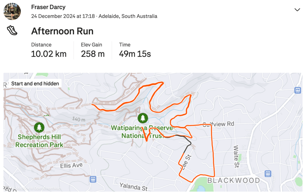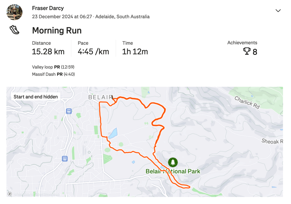 - Thursday: Boxing day run in Belair. A bit tired but still ran ok. Ran in the afternoon at Port Vic in some atrocious wind. Said hello to cousins and long time blog reader Aunty Vicki as per my usual Boxing Day evening antics.