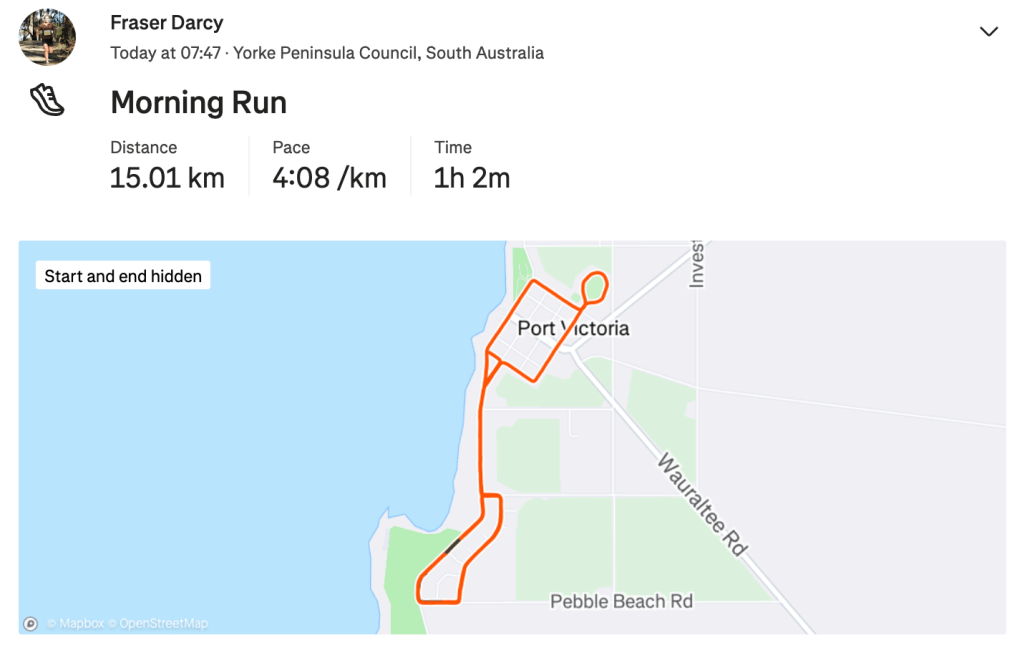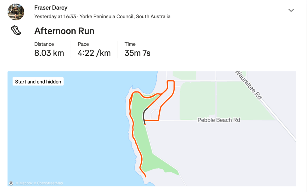 Once at the end of the bitumen road I turned around into a slight cross-wind/head-wind and was immediately in the ‘get through it you bastard’ mindset. I made it back around the 5km mark and stepped off onto a 2km loop I used the last time I was training in Port Vic. This little loop goes past Aunty Vicki’s house and my family’s house and has a nice mix of bends and rolling undulations to keep my mind occupied. It’s also nicely protected at points and I was able to go from averaging 3:30/km into the head wind back to normal 3:20/km pace even with a head wind.