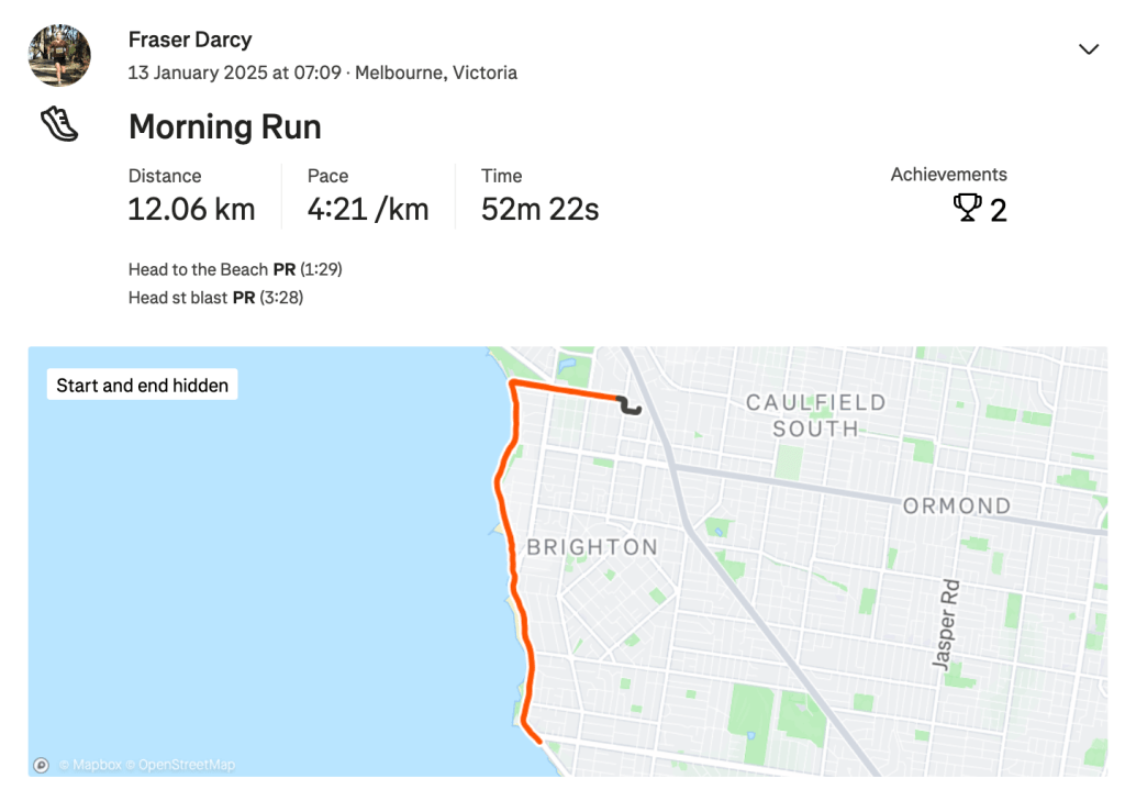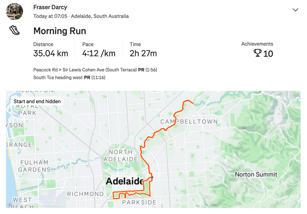 I did feel good though when running past 2hrs and even when I stopped. It wasn’t like any of those 37/38km long runs that averaged below 4:00/km a month ago where the last few km’s were a bit of a shuffle after running substantially faster. But the proof will be in the pudding in the next few days, or like I said at the start, whether I can fit in some hard training and racing in the next couple of weeks and instead blame my next injury on it. Orrrr I could just be positive and go, ‘great, I was able to run 35km’s confidently today, who gives a fuck about what I did last week, live in the moment’. There are plenty of different perspectives and none of them could be right.