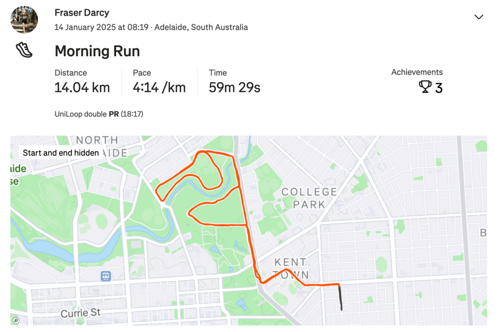 Of course, I didn’t just end my Friday there, I went home and relaxed as best I could around a sewerage issue developing at home. There was a bit of work done, a bit of resting and another run in the arvo. This was a much nicer arvo run than Wednesday as it did flush out a bit of the soreness from the session.