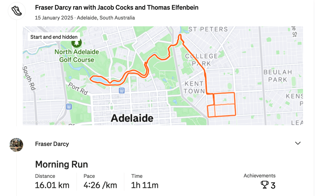 I finished off last week by saying that the priority was to recover well and watch plenty of the Australian Open. So far so good. I feel recovered physically and mostly mentally, having switched into track mode, from the marathon and I have watched a lot of tennis. I’ve even succeeded in bringing Alice’s tennis knowledge from not understanding the terminology of ‘game-set-match’ to suddenly knowing who Jack Draper is and why his lefty serve makes him difficult to face in the ‘ad’ court for our right handed Aussies. Being optimistic one week out from a marathon about my recovery is a trick for young players though so I will not be making any outlandish statements such as; ‘I’m back baby’ or ‘I have recovered and I didn’t get injured at all’ for another few weeks. Basically until I do enough hard training or hard racing that I can blame my next injury on that instead.
