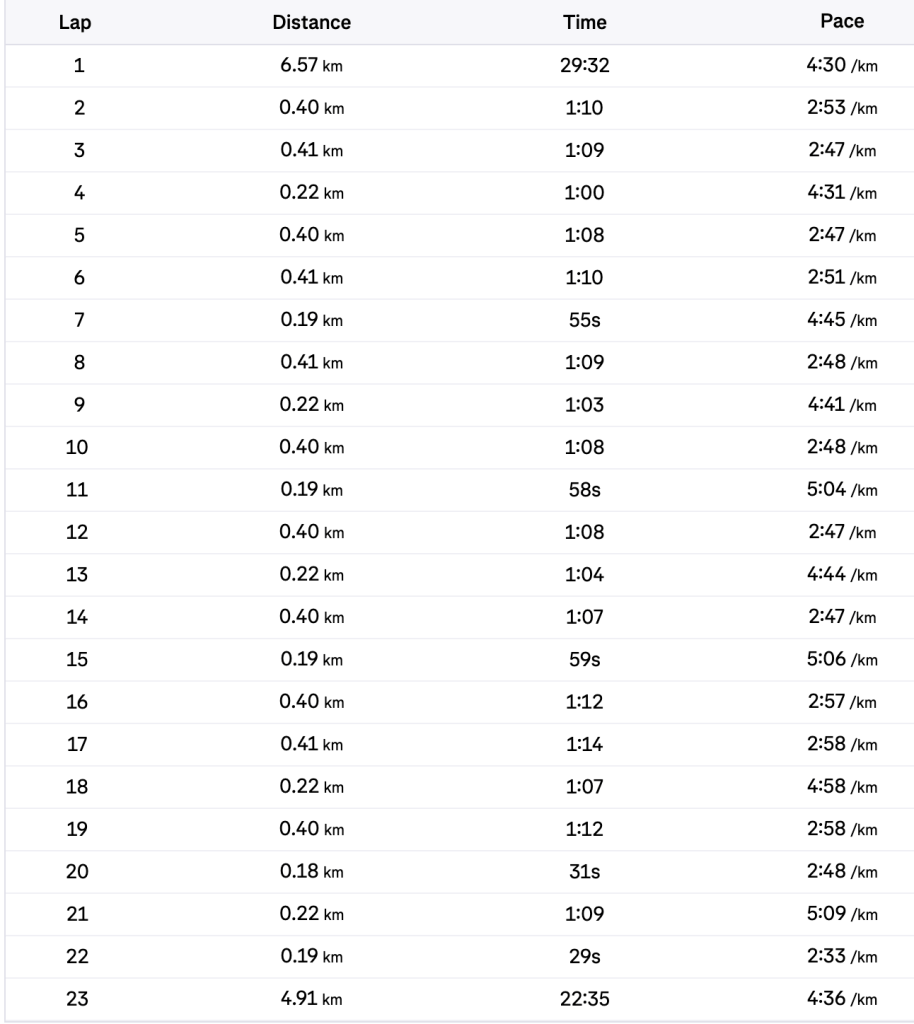 Instead, what ended up happening was I felt good enough on my jog, besides a bit of DOMS still, put on my fast shoes, did a few laps of sprints/jogs and then decided to do some 800/200jog reps. I did a session of 800/200jog three weeks out from when I ran 14:35 in November and remember running 78-80s per lap during the reps so if I could run somewhere around there, whilst also respecting the feel of the session, then I’d be surprised. Instead, what happened was I ran the first one in 70s and held that pace. Oh boy. The same thing happened on the next rep but I could feel things were already going to get out of hand if I kept up that effort so I aborted and did 400’s with a 200 jog instead. This allowed me to keep the reps fast, which is good because I need to make sure I still have the speed to run fast for these 5km’s fast. It’s harder to build that in 3-6 weeks than it has to just buffer the physiological effects at that speed. I did 4 400’s with a 200 jog and then went back to the 800/200jog at a bit slower pace because I was starting to be cooked. I turned the last 800 into a 600 with a fast 200 at the end and then threw in one more 200 for good measure. For having no expectations on myself and ending up with 20 minutes of good track I was pretty pleased. I did feel pretty cooked for the rest of the day and worried I’d overdone it but, as I sit here the day after putting 90% of this together, I think I got the effort just right by aborting on those 800’s early on. And as I sit here on Sunday touching it up, I am more confident I got the effort right.