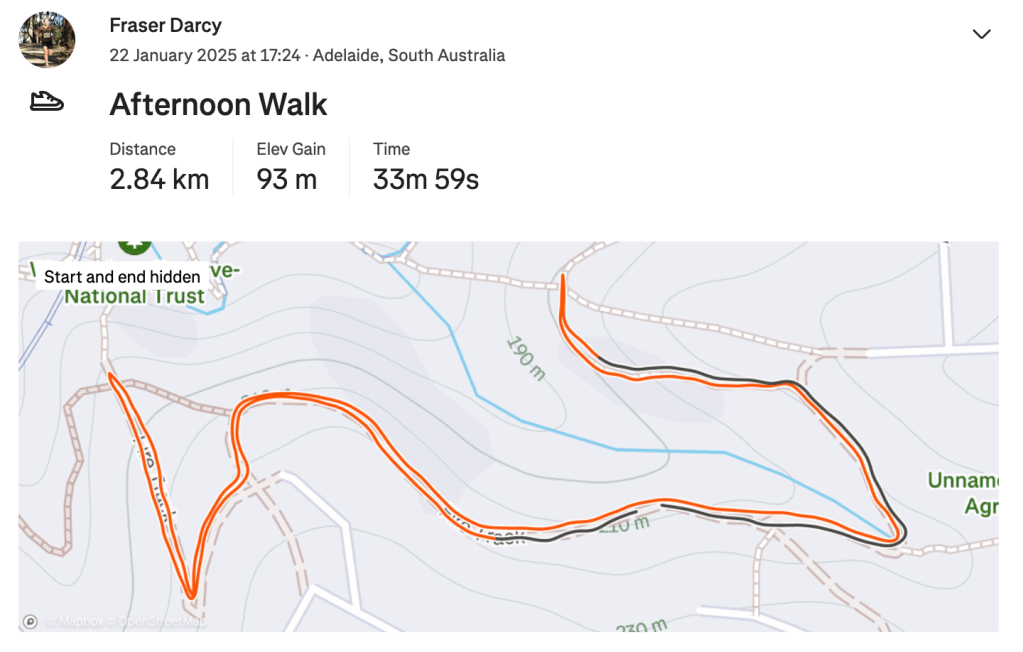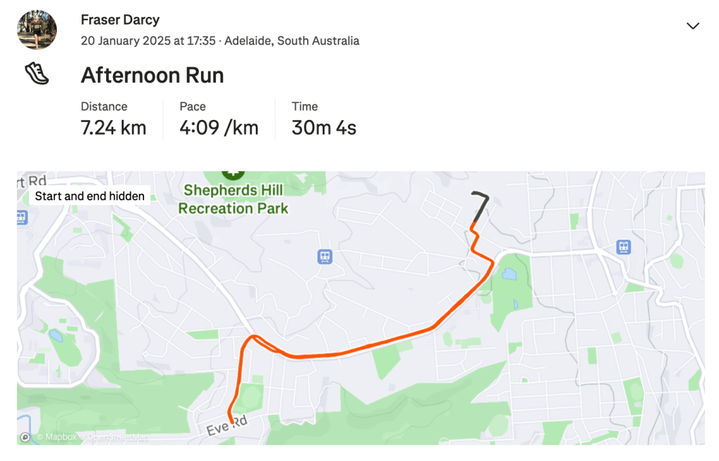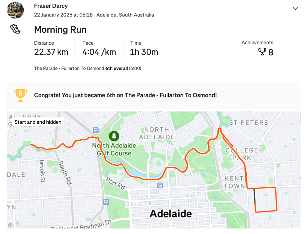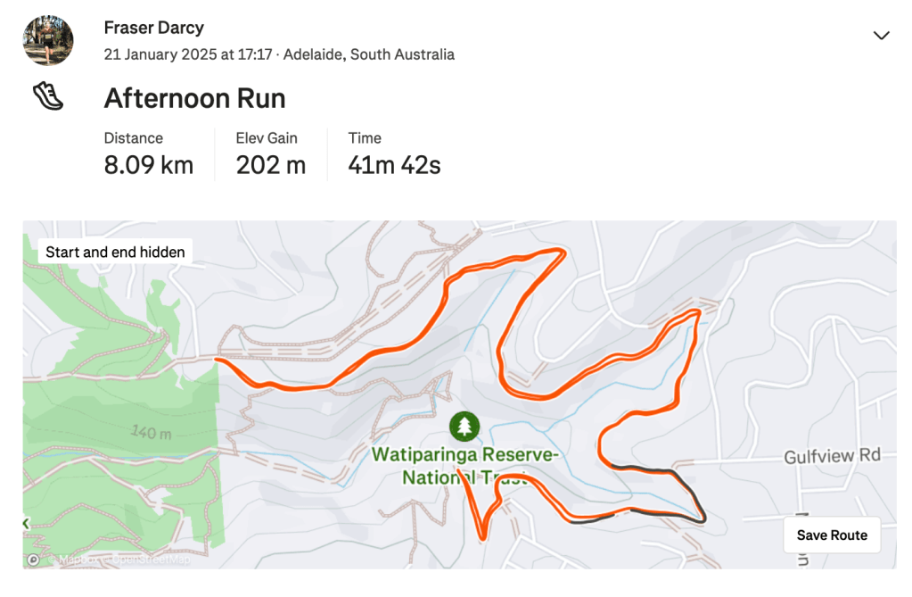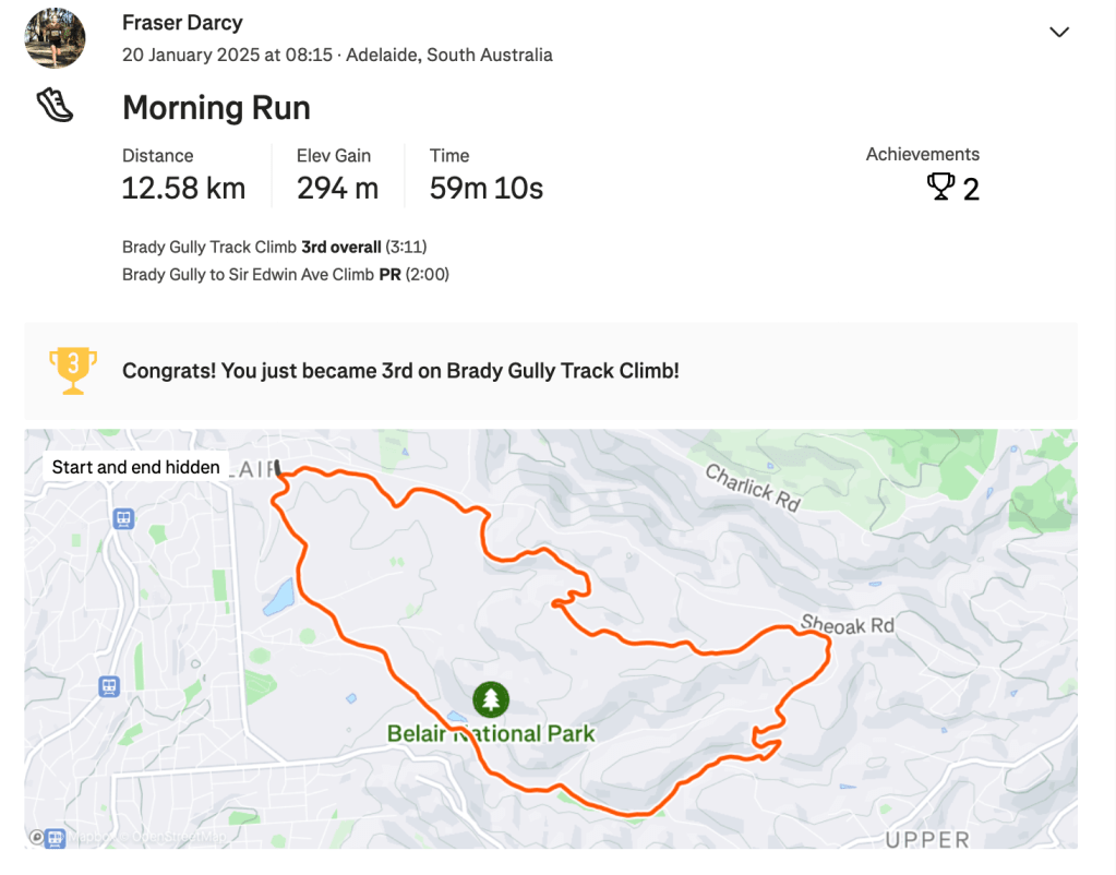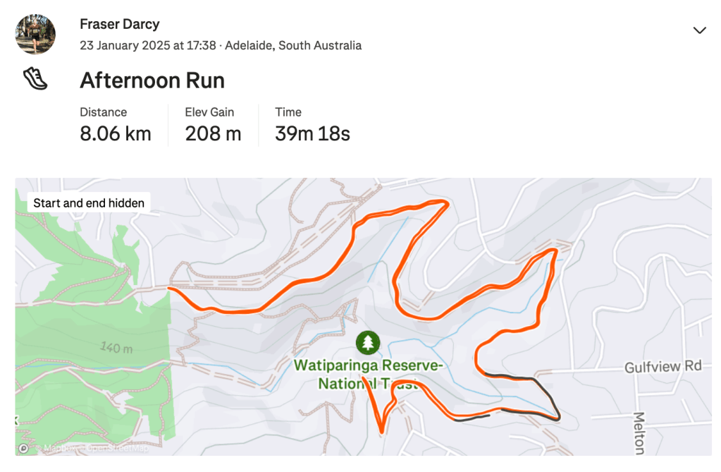 Here we are at another weekly recap. As alluded to last week, the aim of the game in the next month or so is trying to sharpen up my speed over 5km. To do that meant on Monday I ran a nice easy hour at Belair instead of 16-18km’s like I had been doing all of December. I even ran it a bit quicker than I probably needed to because I had spent the morning putting something together for TBL and then I also had a dentist appointment to get to. The busyness continued with a gym session before lunch, an important nap post lunch and then I started to put together some programs for February for RAO. Of course, there was an easy arvo run and I reluctantly did some strides. I felt a lot better after the strides so I was glad I pushed through my reluctance.