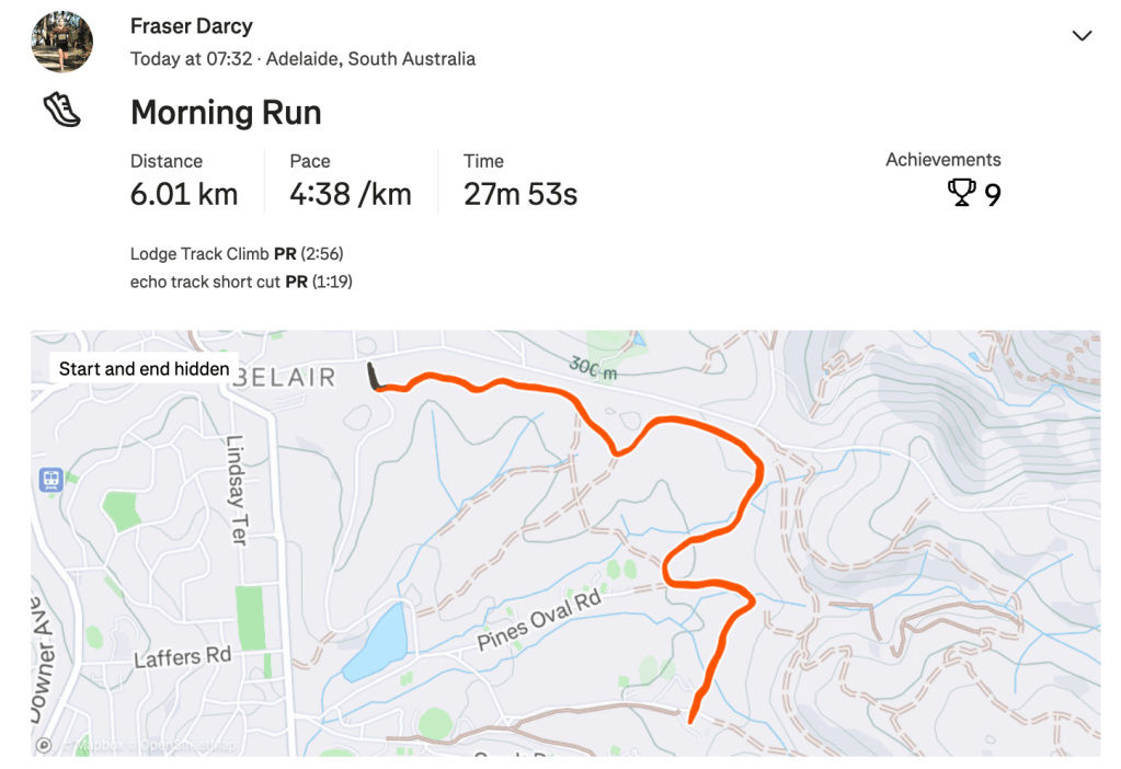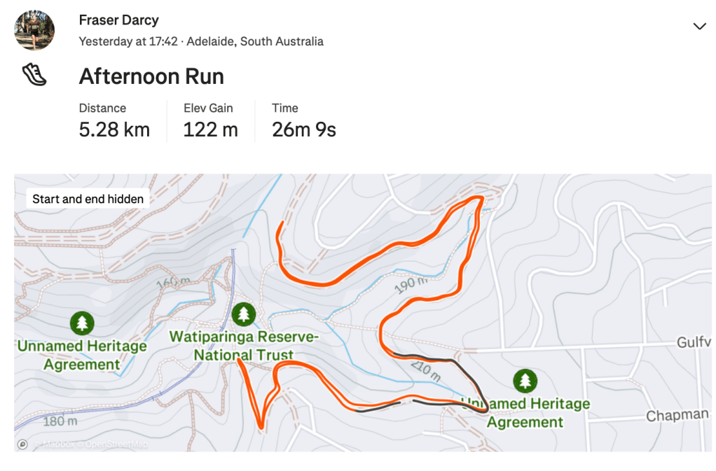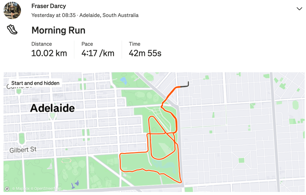 Which was good to have more recovery time because I wanted to fit in one more mini session before Saturday’s State 3km race. On Thursday morning on my way back from Alice’s to Eden Hills I stopped in at Bowker St oval and did a little 15 minute session just to get a feel for the track again. I really enjoyed taking a warm-up route over to the train line, stopped to say hello to an outdoor ed mate, ran past Emma’s house and basically relived some memories from the time I used to live at Marion from 2013-2017. After a suitable warm-up and some strides I got on the grass track and ran 5 sets of 400/200float which is 5/8ths of a typical session. I felt pretty good and glad I stopped at the 5th one as I was starting to get quicker and quicker in the 400’s and may not have been able to properly hold myself back. That was the ‘threshold’ part of the session done and at 3km’s worth, it’s not enough to move the needle physiologically but it was the perfect mental prep for Saturday’s 3km race. To top off the session I put on my spikes and ran three 400m efforts at 95% effort with 60s rest. The first one was 64, good, the next one 62, wow, was that a fluke, and the third one was also 62 so no it wasn’t a fluke. That’s probably the fastest 400m reps I’ve ever done in training and none of them were full out sprints from the gun so it would be nice over the next few weeks to see if I can get a sub 60 going.