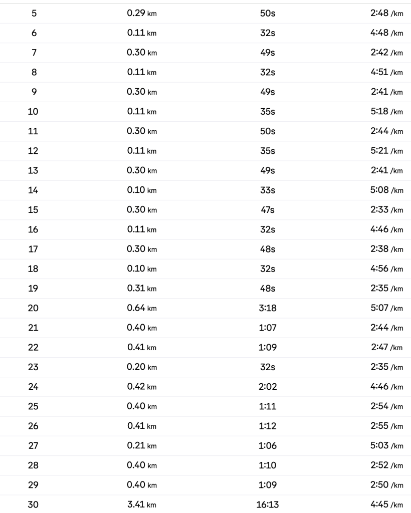 When we came to the 1k hard I ran it with Luke and opted to sit behind him for the first 600-700m before moving around him and finishing strong to run 2:49. Pretty good but not amazing. We jogged slow in the 400 jog and then aimed to take the 800’s at tempo effort. Possibly as a sign of my fitness or my lack of pace control, I ended up only running 2-3sec slower in the 800’s per lap than the 1k hard. It did feel like tempo though so I maintain that I trained to the right intensity.