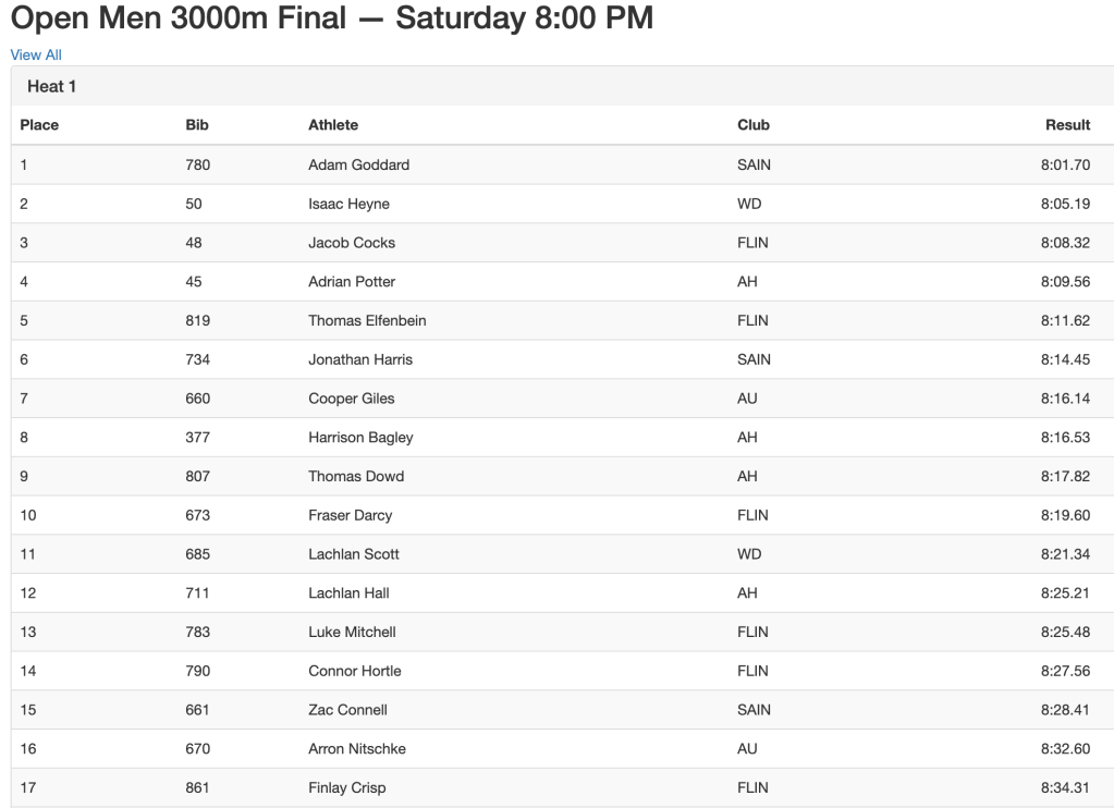 The RAO crew went for a warm up of 4k’s, did some strides waited around for a delayed start and then we got going. I was ‘seed’ no.17 which meant out of the 20 people in the race I had the 17th fastest PB or ‘seed’ time and would be starting on the very outside. All good, means I can let others drag the pace out the front. With a deep front end of the field I didn’t fall into the trap of being caught on the front leading the race like last year. Instead, I settled into somewhere around 10th and was running in lane two for most of the first lap and a bit until there was a suitable pace established in the second pack and I had enough clear air to get out in front. I could’ve tried to work my way into the second pack somewhere but instead just moved to the front and kept running the 66 second laps we were doing as that’s the easiest way to stay out of trouble.