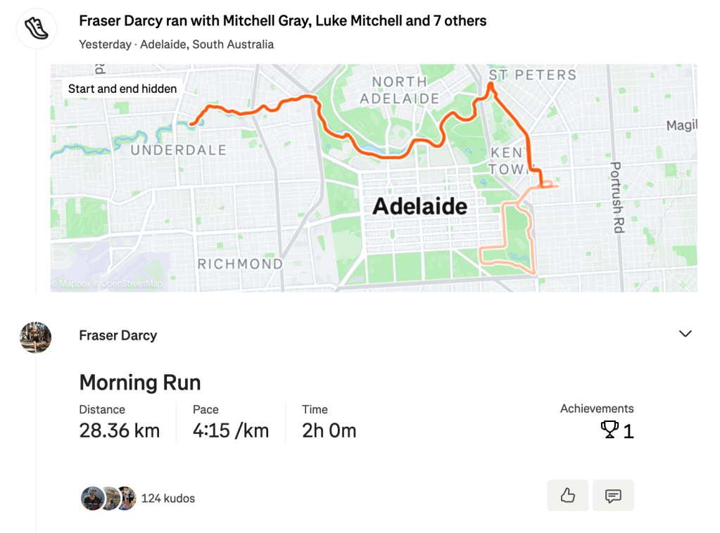 Wednesday. I was prepared to run by myself on Wednesday morning as Jacob and a few other mates were meeting at 8am and I wanted to get going earlier but late the night before Jess Stenson flicked me a text which was great. It meant I was able to have some company for 80-90 minutes and run at a good steady pace and start nice and early. We hadn’t caught up since Port Vic so spent most of the run chatting about Port Vic, Cadbury and the Aussie Open ensuring the 90 minutes I ended up running flew by. Last week’s Wednesday run I felt a bit average but this one I felt good, noticeably running some easy faster km’s once I parted ways with Jess. The rest of the day I lived off the high of a good morning run by getting some work done, getting into the gym, getting TBL organised nice and early and then having another nap. I was planning on getting out for another run in the afternoon but felt a bit tired by then so canned it and just walked instead. Maybe if I’d run only 70 minutes at 4:00/km average or a slower 90 minutes I could’ve gone for my double but I’ll argue that 90 minutes faster in one run is a better stimulus than two runs as it gives my body more time to recover.