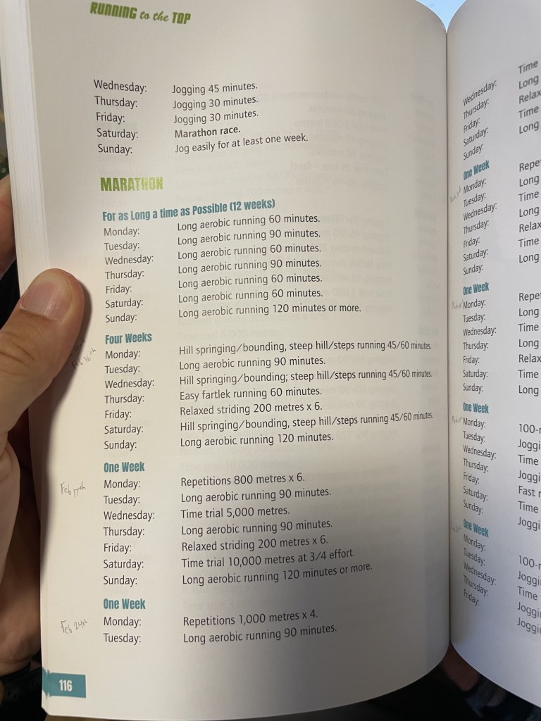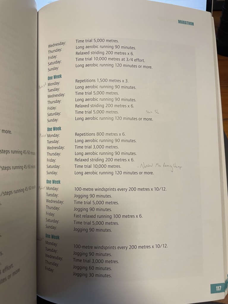 I had already planned my training up until Ballarat loosely but wasn’t too enamoured by the idea of if I get stuck doing the bike job at Tuesday/Friday sessions with RAO then I am always doing my sessions after the group ones when I am a little tired. It would be better if I did them on any of a Monday/Wednesday/Thursday/Saturday. After consulting with my Lydiard resources I did realise that it is possible to train hard on a Monday after a 2hr long run as that’s what he prescribes, and then that means I can train again on a Wednesday and a Saturday. Nailing three hard sessions a week, plus two other 90 minute jogs and a 2hr long run is a full weekly schedule under Lydiard. All up, plus a few doubles, that equates to around 180-200km’s which is what I managed for Cadbury and I hope to do again for Ballarat. Following one particular schedule of Lydiard’s it also fits in nicely with the following breakdown: