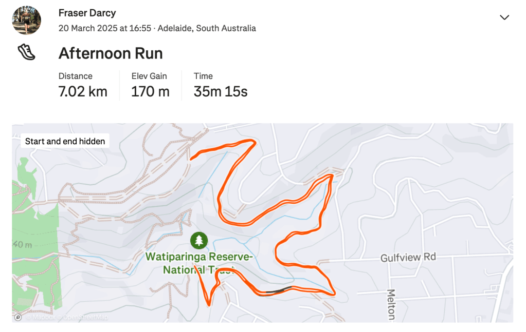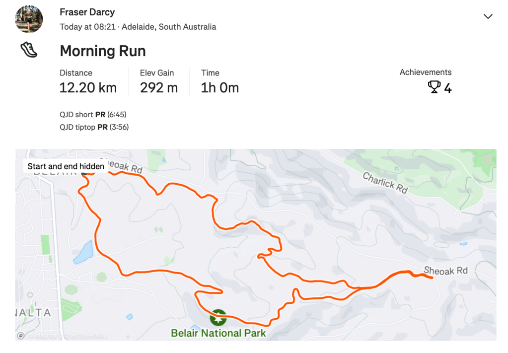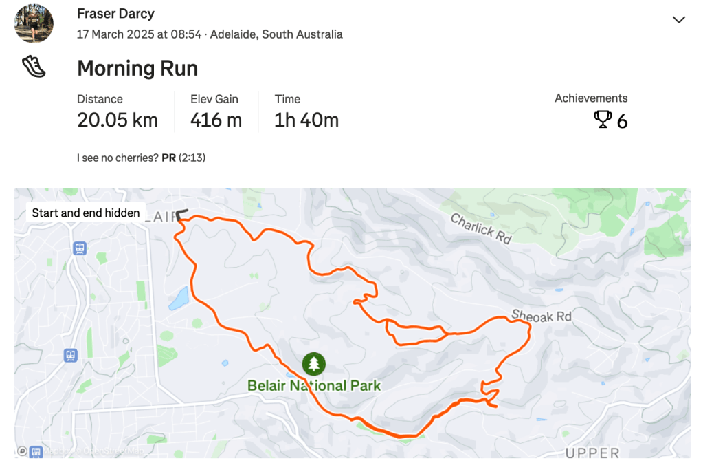 Unless you go to sleep and wake up on a seperate day. Like on Saturday. I ran 12km’s on Belair and took it fairly easy, not pushing myself to get rolling and just enjoying a nice Saturday morning before a busy-ish day of helping Alice move some furniture and then watching the Bombers lose. We did kick a lot of goals though which was good. Adelaide just kicked a lot more. I ran again in the afternoon and fit in a small mobility session to keep myself and my muscles happy.