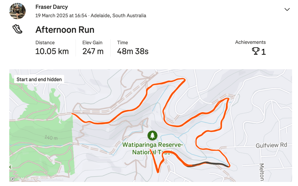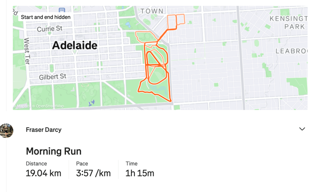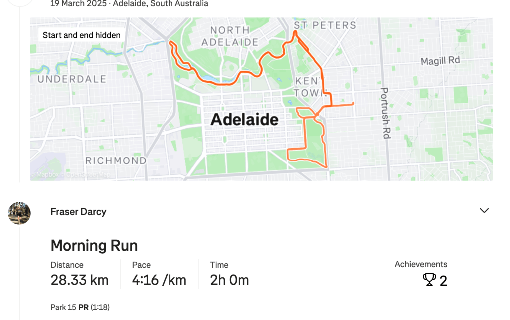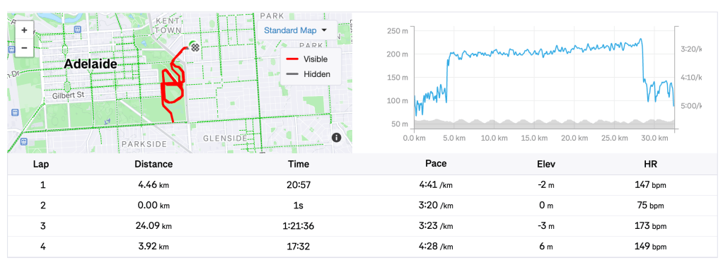 At the forty minute mark of my effort, when the RAO session stopped, I put on some music and really got to work. I hadn’t planned where I would go for the next forty or so minutes so I was happy enough to just keep running on the same 1.9km loop. It allowed me to focus on the absolute banger of a playlist that came through my airpods and for the first time in a few weeks I got lost in my own world. I hadn’t been in this zone for a while having been thrashing track sessions focused on specific lap times. Running to feel I was able to progress my pace from 3:30/km down to 3:15/km which is probably the pace I’ll aim for in my marathon. Not that I’ve really worked that part out yet. After 20km’s of running I felt like a change of scenery and went to a smaller 1.2km loop to finish off. I ran two laps there and then realised that with only 2 km’s to go if I just went back to the 1.9km loop I could do one more lap and I’d be done. So I did and besides my hamstring’s feeling tight at the end I felt good. Not like I was over working and not like I was running out of energy. Good signs!