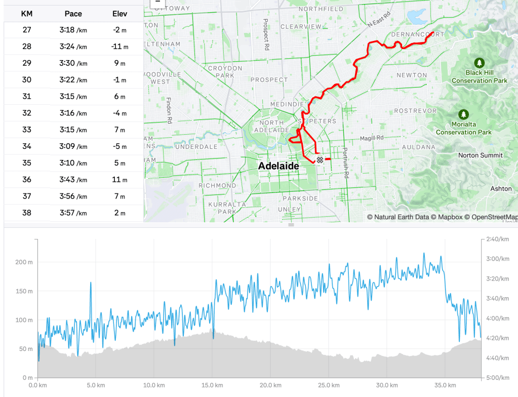The fortnight of racing and cooking myself was over. Time to take a breath and change focus from track and trails to the forty two kilometres of a marathon. On Monday, I woke up feeling not too bad energy wise but my legs were very sore. I deliberated about running along the Sturt River to save my legs but my head couldn’t stand the thought of having to dodge people and cars when crossing the road so I went to Belair and just suffered through it. Until I bumped into Michael Nitschke that is. I know Nitta runs in Belair on Monday’s and this is probably the third or fourth time I’ve bumped into him. It always results in a good chat and a few more easier km’s which brought my total on this run to 20km. A good start to the week except for some sore legs. I caught up with some admin, work, a little bit of gym and then another sore arvo run to finish off the running part of the day. The day continued on after dinner with an appearance on the Peak Pursuits podcast which was cool.