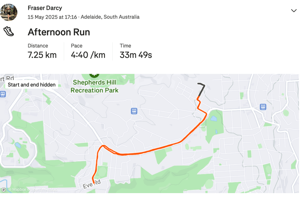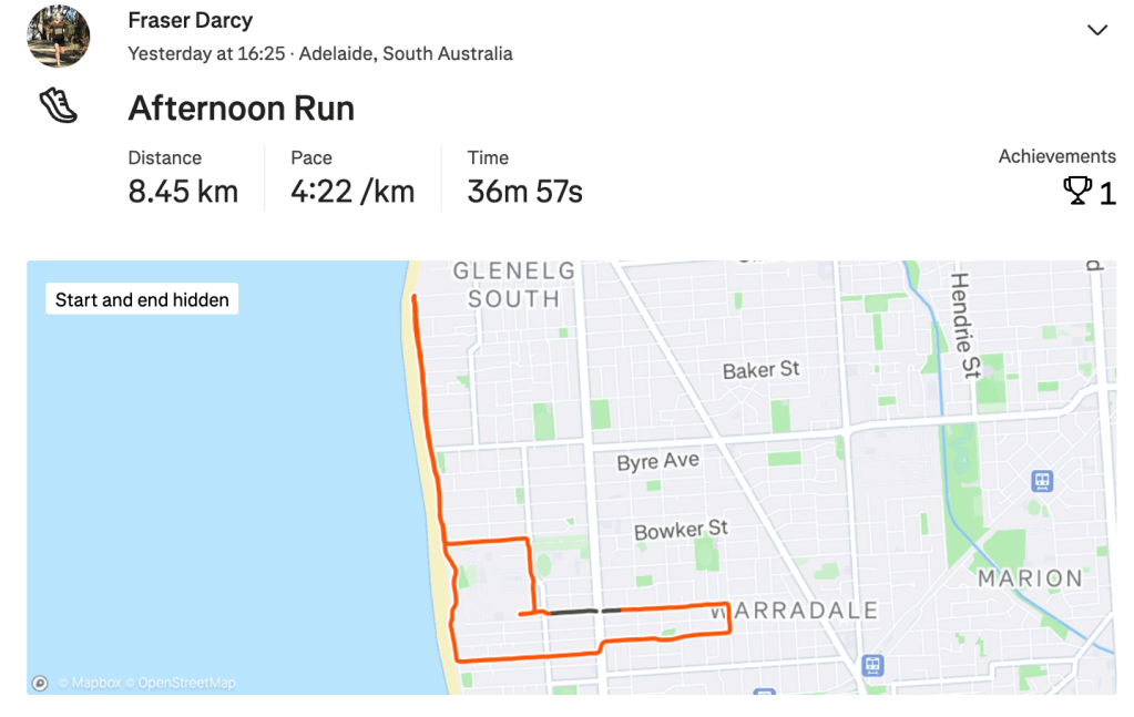 So it was a good session in the end. I didn’t have too much time to reflect on it but at least I could carry that positive start to the day through to my next task; picking up a fridge from Woodville for Alice. Yes, Removalist Fraser was back this week and having learned from my past removalist jobs, I had a better attitude for this one. The rest of the day was pretty cruisey, did some work from Mum and Dads on my computer and then went for an afternoon run. This arvo run was similar to Saturday’s arvo run from last week in that it turned into a steady progression. I was half doing an experiment to see if I could handle two sessions in a day off the back of an intense morning session. I of course did manage this, doing two marathon specific sessions in one day in the special block, but coming off 8*1km is slightly different. On this occasion, the arvo run at 3:30-3:40/km was a good little test which I passed, I felt fine, but more importantly it was again very fun to run that fast. Did it actually help my fitness though? Or just hinder it? Hard to know but I did pull up fine and sometimes gaining fitness isn’t the only reason I run!