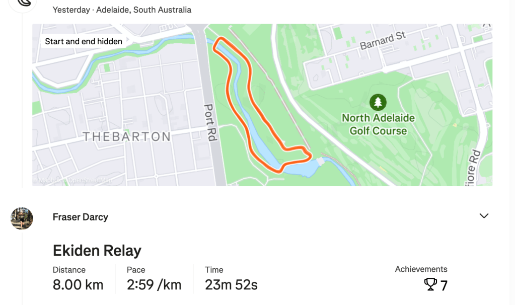 Saturday. The only negative thing about the Jimeoin show was that it was the night before the Ekiden Relay. It’s not ideal prep but neither was moving furniture but the worlds not perfect… Last year I ran sub 24 minutes for my 8k leg and my team won the race in a Course Record time. This year, I also ran sub 24 minutes for my 8k leg and my team came second by only a handful of seconds. Everyone improved on their result from last year but we were just beaten by a better team on the day. At first I was hoping to run a bit quicker than I did, running the same time I did last year makes me feel like I haven’t improved at all, but upon reflection it was still a good time. Last year when I ran that time I was right in the middle of a good training block and was primed for a half marathon (Sunshine Coast was the following week). This year, coming off the disjointed taper and recovery weeks I was unsure, especially given how cooked I felt on Friday, how my body would go trying to hold 3:00/km pace. Turns out it just managed to scrape through. Perhaps if I was a bit fresher I could run ten-fifteen seconds quicker but I wasn’t so I didn’t.