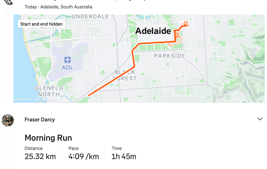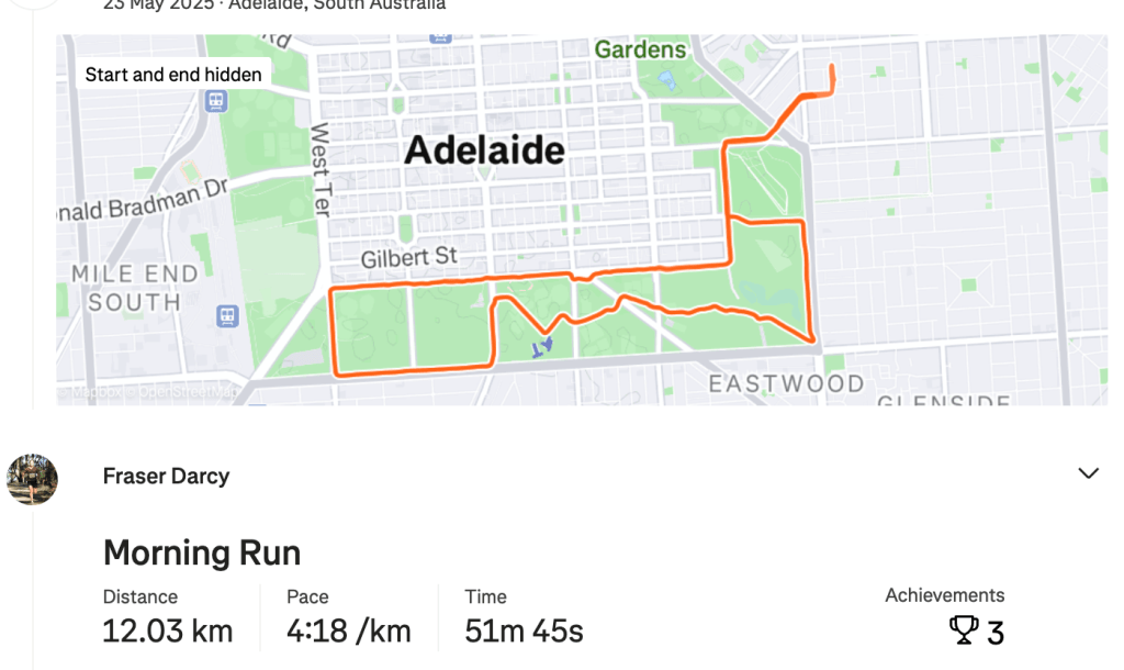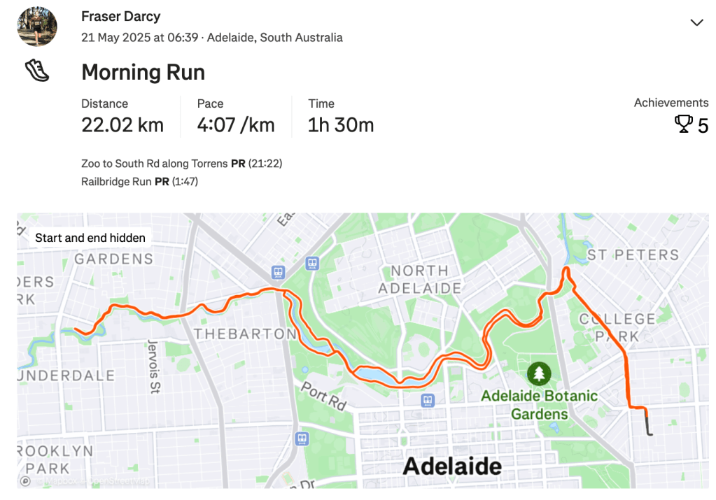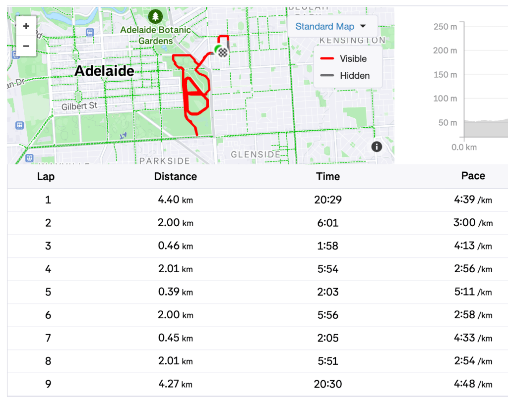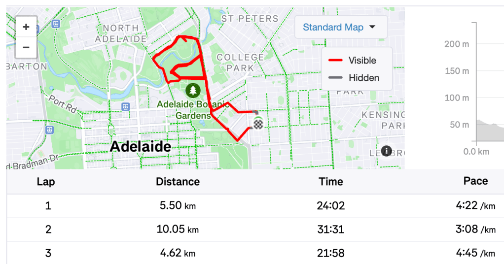 Thursday. Session day for me and the third week in a row of doing so in the city on a Thursday. This meant that I could drive Alice into the city for the third time in a row this week as well, saving her catching the train/bus. After doing some work at The RunHouse I got out for a run with Adam and Riley just after 9am. We weren’t doing the same session but it was still nice to warm up together. I changed into my Alphafly 2’s and took off on what I hoped would be 10-12k at goal HMP (under 3:10/km). If I couldn’t hold goal HMP comfortably then I would break it up into 12min blocks (or just under 4k’s worth). I believe I’ve said this before on fraserdarcy.com but I’ll say it again; this is exactly the type of session that lots of runners do very frequently however for a number of reasons (marathon training, trail running, frequent racing) I tend to not make room in my schedule for a session like this. Hence, it was a real treat to lock into a 10k at the same effort and just tick off the kilometres.