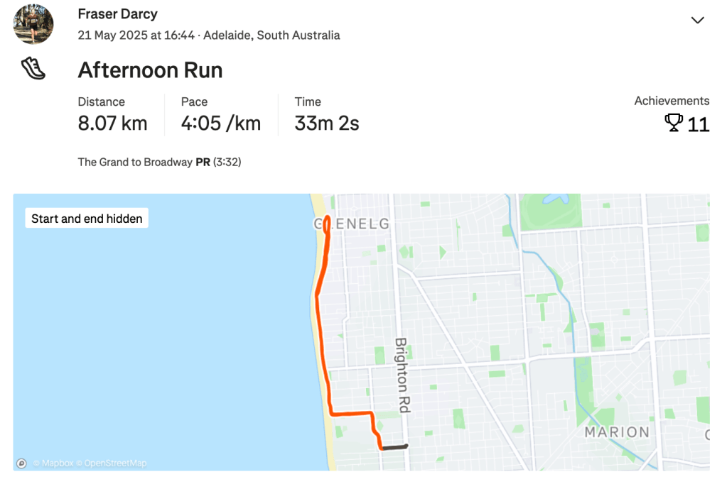 And that was of course only Thursday afternoon! I still had to go out for my double which I did along the beach for the second night in a row. It’s a real change in scenery and routine having so many more options to double from home. Living in Eden Hills it felt like all my doubles were limited to a certain few routes to avoid hills and traffic. Back in Quorn I had ample routes to choose from which were all flat and so I’m starting to adapt back into that mindset. Which is funny, because I moved to Quorn with the mindset of getting better at outdoor things and then specifying that into running. Now I’m bringing that mindset back, and sharpening it up a bit having learned a few things from Quorn life, and applying it to North Brighton life. What steps forward can I make with my running and life whilst living in North Brighton? I didn’t expect to make an Australian team when I moved to Quorn but I did. What unexpected achievements lie in my future whilst living in North Brighton?